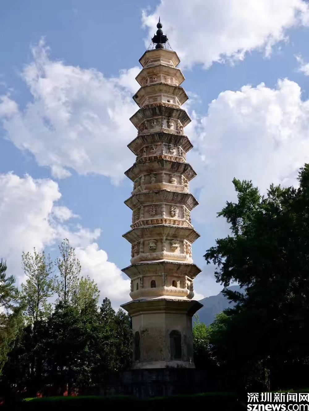 在千尋塔的塔頂四角,原來(lái)鑄有4只巨大的金翅鳥(niǎo),“金翅鳥(niǎo)”又名“大鵬金翅鳥(niǎo)”,為佛教護(hù)法神中的“天龍八部”之一,傳說(shuō)能鎮(zhèn)水患,后毀于地震。李仁奇 攝