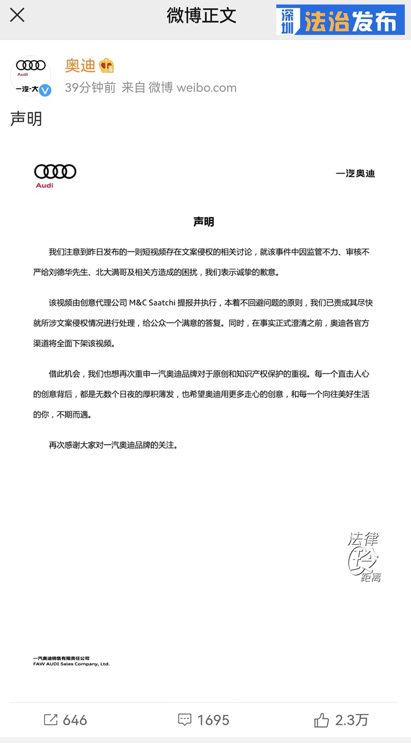 5月22日,奧迪官方全面下架了這部短片,并發(fā)布了道歉聲明。從奧迪公司的回應(yīng)得知,該短片由創(chuàng)意代理公司M&C Saatchi(上思廣告)提報并執(zhí)行,上思廣告也在微信公眾號發(fā)布聲明,承認團隊在未與版權(quán)方溝通的情況下,直接使用了抖音博主北大滿哥關(guān)于“小滿”的視頻中的文案內(nèi)容。