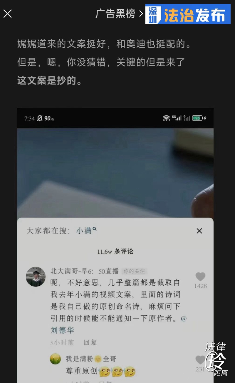 讀特客戶端·深圳新聞網(wǎng)2022年5月24日訊(記者 張玲 翁任瑩 實習生 趙薇)5月21日是中國24節(jié)氣的小滿,奧迪公司一則小滿廣告迅速成為刷屏爆款。在這條名為《今日小滿,人生小滿就好》的廣告短片中,出鏡代言人是劉德華,他用娓娓道來的口吻說著“小滿代表了一種人生態(tài)度……”然而,不到1天的時間,奧迪小滿廣告就深陷文案抄襲風波,博主“北大滿哥”指出這部短片幾乎全文抄了自己去年發(fā)布的小滿視頻文案。