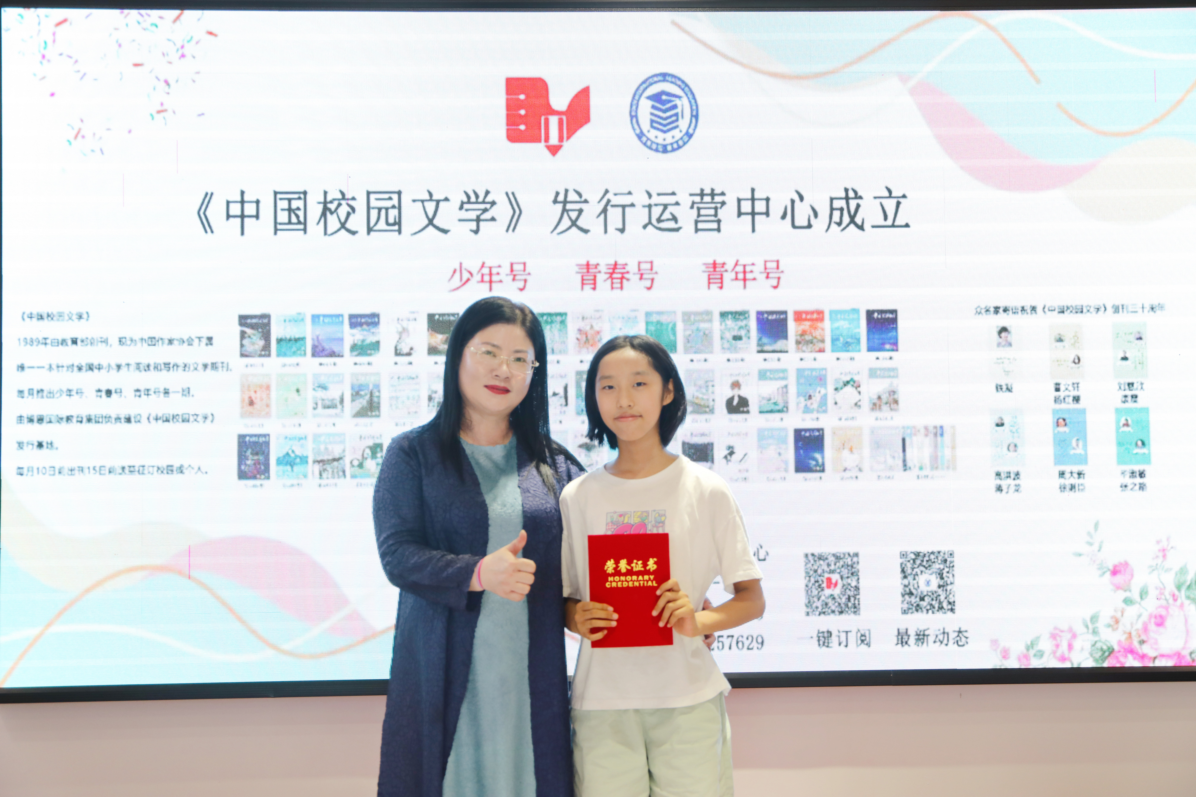 全國文學盛典聯(lián)合發(fā)起人、創(chuàng)始人肖硯寧為優(yōu)生代表頒獎并合影