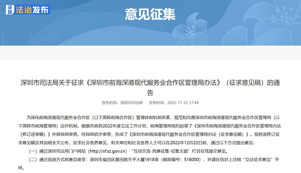 讀特客戶端·深圳新聞網(wǎng)2022年11月24日訊(記者 翁任瑩)近日,深圳市司法局發(fā)布《深圳市前海深港現(xiàn)代服務(wù)業(yè)合作區(qū)管理局辦法(征求意見稿)》(以下簡稱《辦法》)及說明全文,并向社會各界征求意見。