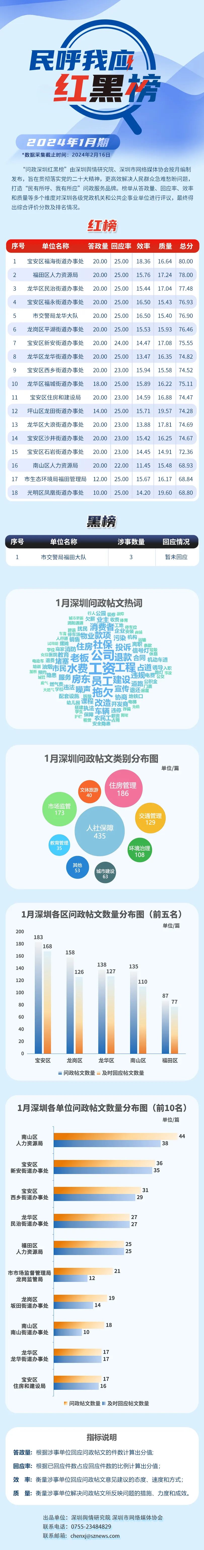 據(jù)悉,本期榜單采集的帖文主要來自深圳論壇、深圳各區(qū)政府官網(wǎng)、人民網(wǎng)領(lǐng)導(dǎo)留言板等平臺,所采集帖文發(fā)布時間為2024年1月1日至1月31日。