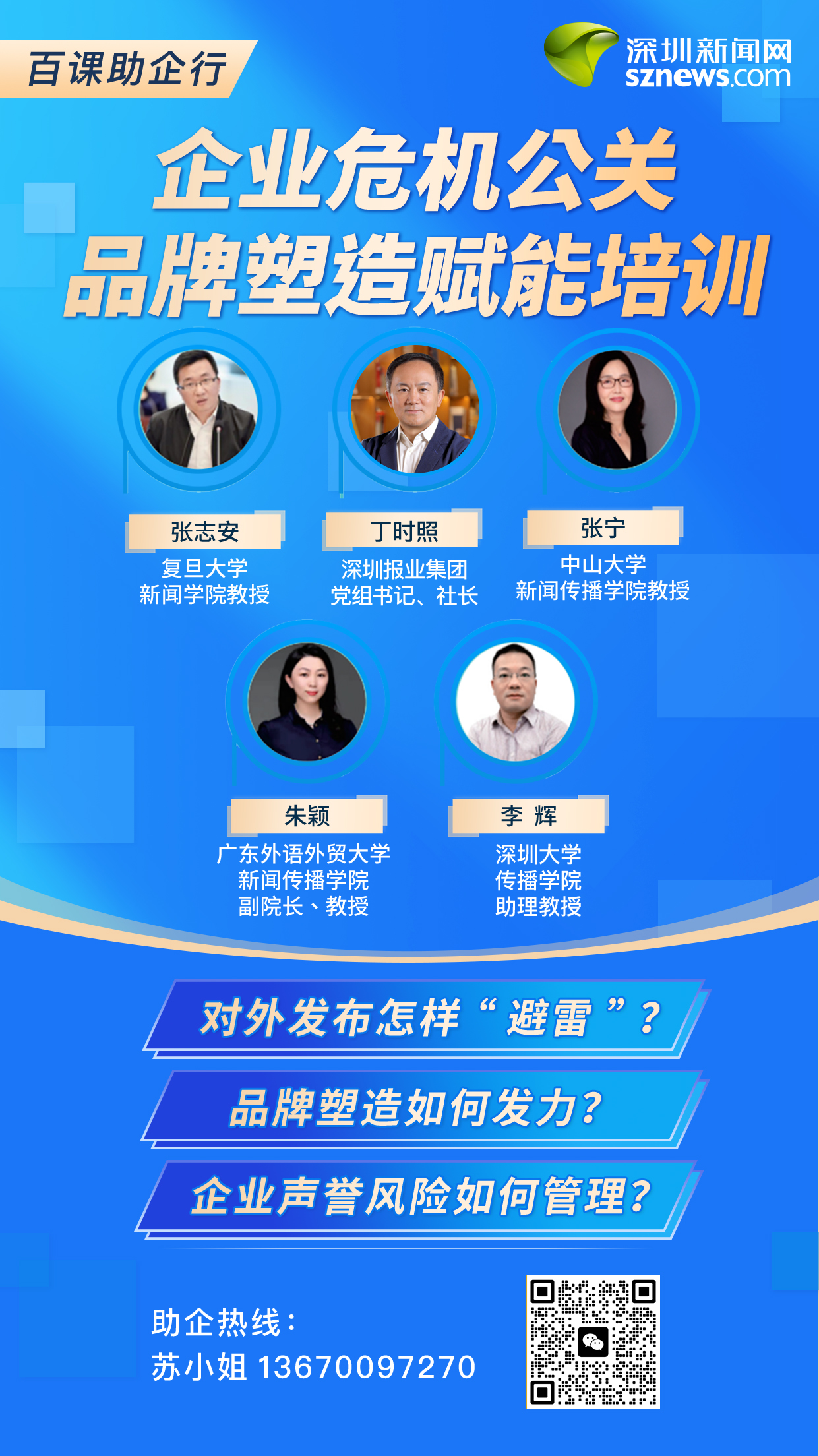 深圳新聞網(wǎng)以長(zhǎng)期輿論研究及智庫(kù)服務(wù)經(jīng)驗(yàn)為支撐,不斷充實(shí)師資庫(kù)、豐富課程體系。目前,智庫(kù)團(tuán)隊(duì)包括復(fù)旦大學(xué)新聞學(xué)院教授張志安,深圳報(bào)業(yè)集團(tuán)黨組書(shū)記、社長(zhǎng)丁時(shí)照,中國(guó)青年報(bào)編委曹林,中山大學(xué)新聞傳播學(xué)院教授張寧,廣東外語(yǔ)外貿(mào)大學(xué)新聞傳播學(xué)院副院長(zhǎng)、教授朱穎,深圳大學(xué)傳播學(xué)院助理教授李輝等近百位來(lái)自公共關(guān)系、新聞傳播領(lǐng)域?qū)<摇?/p>