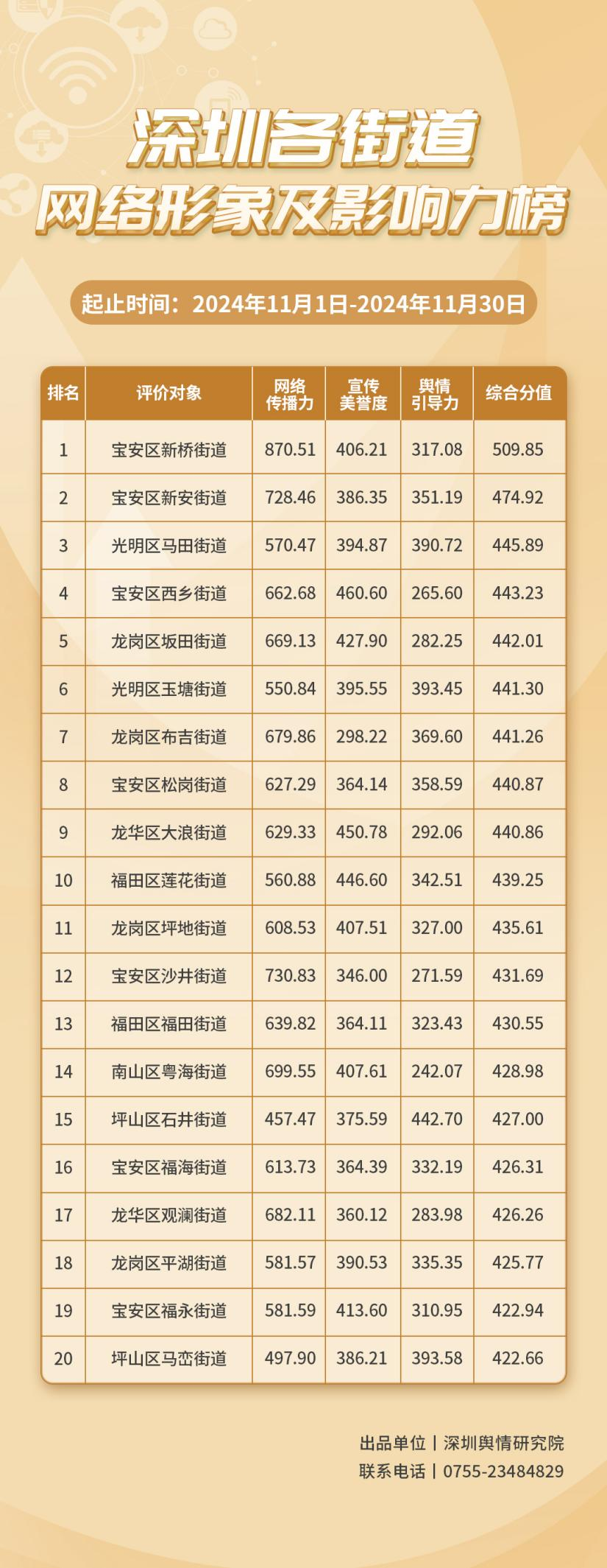 2024年11月,各街道不斷探索治理創(chuàng)新路徑,致力于實現(xiàn)效能的顯著躍升,《深圳各街道網絡形象及影響力榜》(11月榜單)正式發(fā)布,為您揭曉哪些街道網絡形象治理實效顯著,成標桿,本期榜單數(shù)據(jù)統(tǒng)計范圍為2024年11月1日至11月30日。