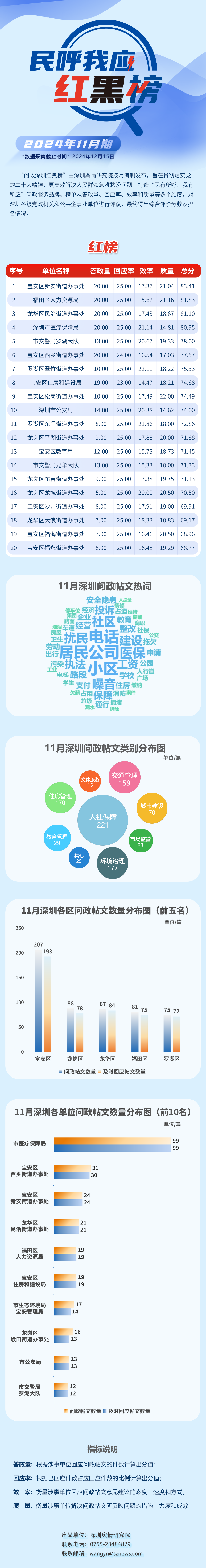 本期榜單采集的帖文主要來自深圳市及各區(qū)政府官網(wǎng)、深圳論壇、人民網(wǎng)領導留言板、深圳新聞網(wǎng)“民呼我應”等平臺,所采集帖文發(fā)布時間為2024年11月1日至11月30日,采集截止時間為2024年12月15日。