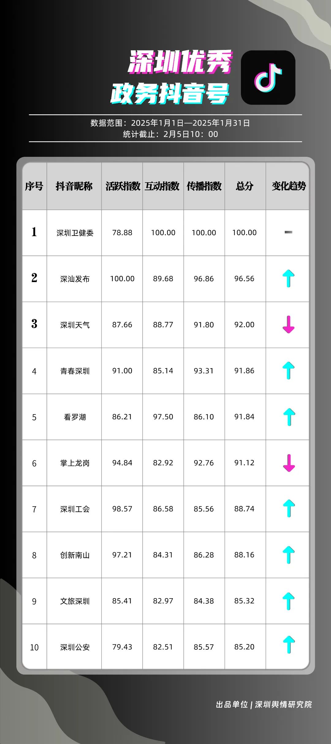 1月,“深圳衛(wèi)健委”“深汕發(fā)布”“深圳天氣”“青春深圳”“看羅湖”“掌上龍崗”“深圳工會(huì)”“創(chuàng)新南山”“文旅深圳”“深圳公安”共10個(gè)政務(wù)抖音號(hào)獲得“深圳優(yōu)秀政務(wù)抖音號(hào)”稱號(hào)。“深圳衛(wèi)健委”“深汕發(fā)布”“深圳天氣”成績(jī)優(yōu)異,綜合實(shí)力較強(qiáng),位于榜單前列?!扒啻荷钲凇薄翱戳_湖”等賬號(hào)排名有所提升,彰顯了這些賬號(hào)在拓寬受眾基礎(chǔ)、增強(qiáng)用戶黏性等方面所取得的積極成效。