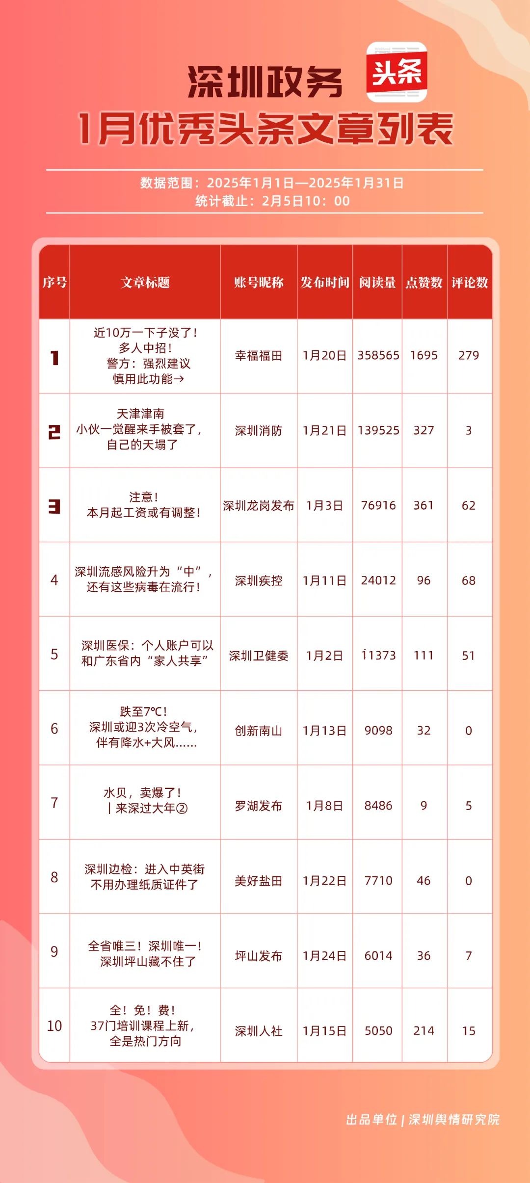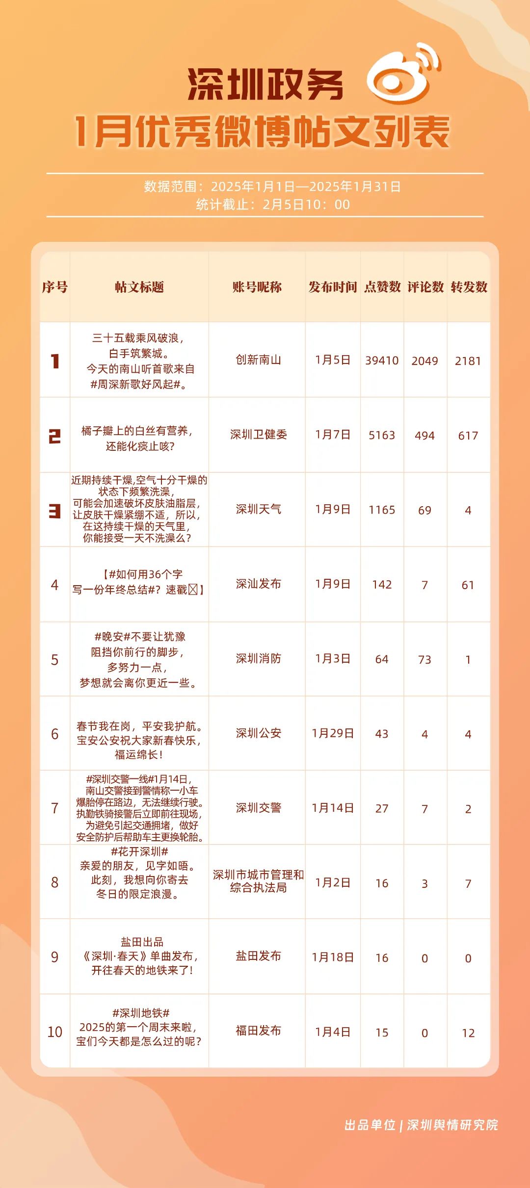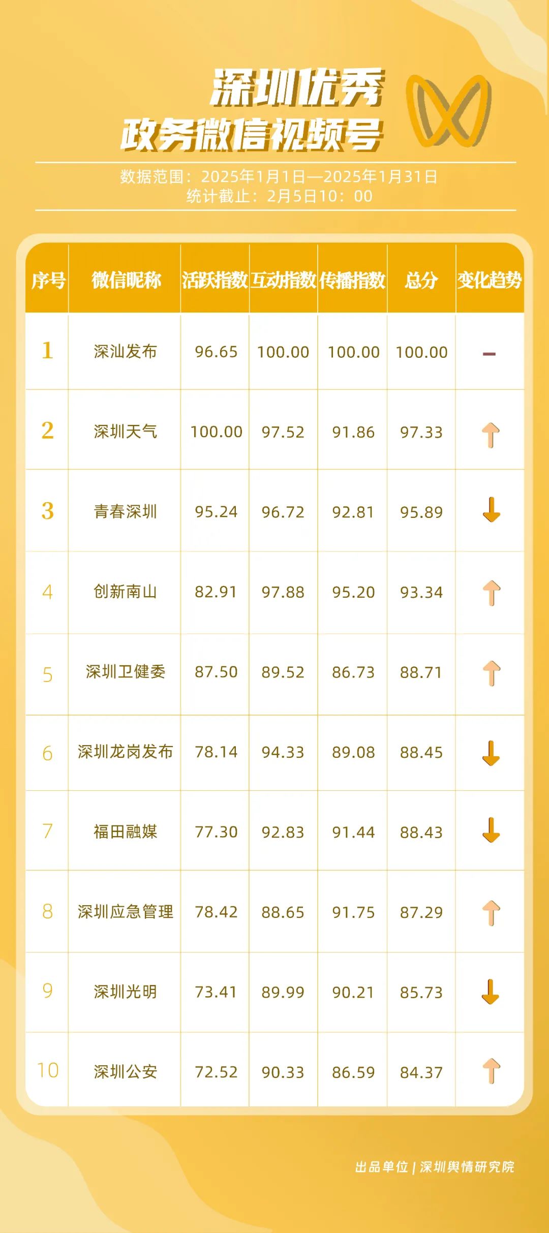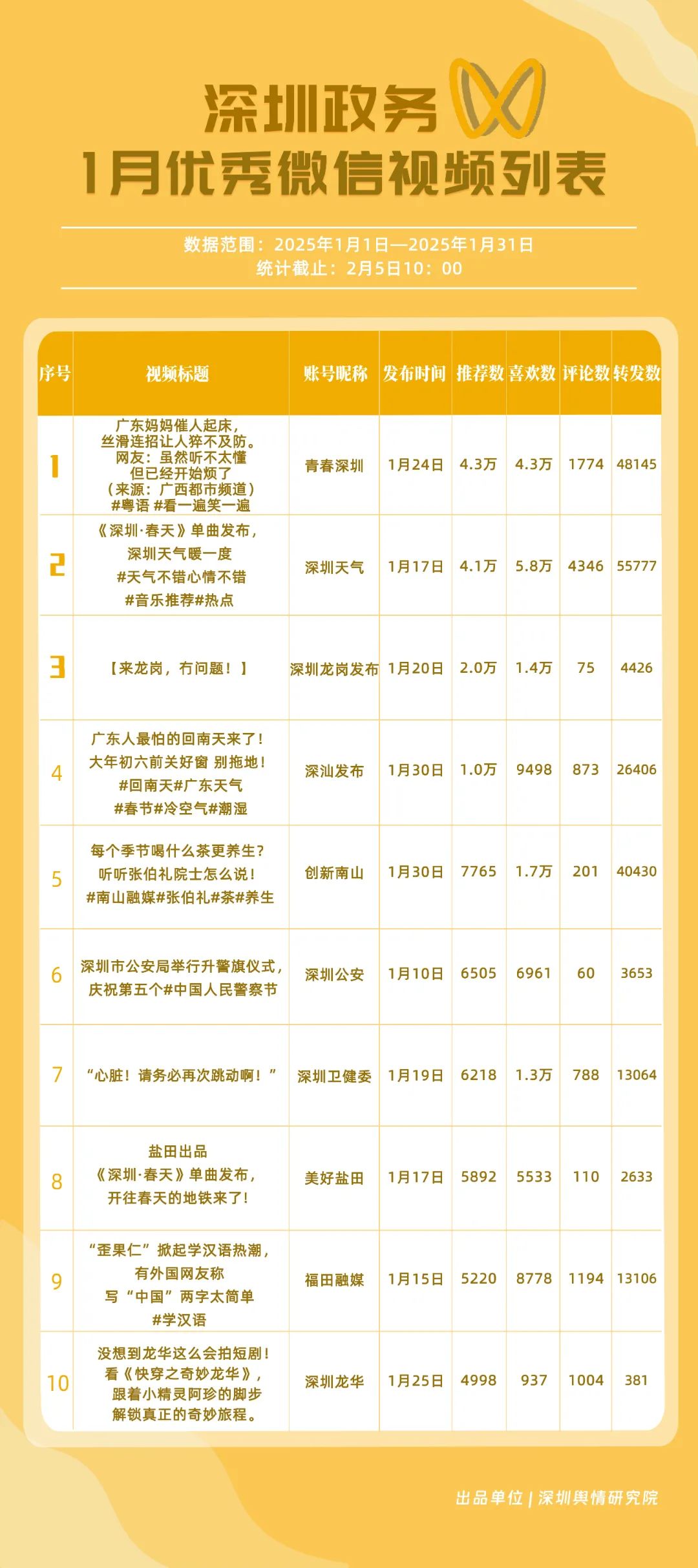 2025年1月期《深圳優(yōu)秀政務(wù)新媒體矩陣》發(fā)布,一同揭曉哪些政務(wù)新媒體矩陣能夠憑借其卓越表現(xiàn)脫穎而出,成為推動(dòng)政務(wù)信息傳播與服務(wù)模式創(chuàng)新的領(lǐng)航者,引領(lǐng)政務(wù)新媒體運(yùn)營(yíng)邁向新高度。
