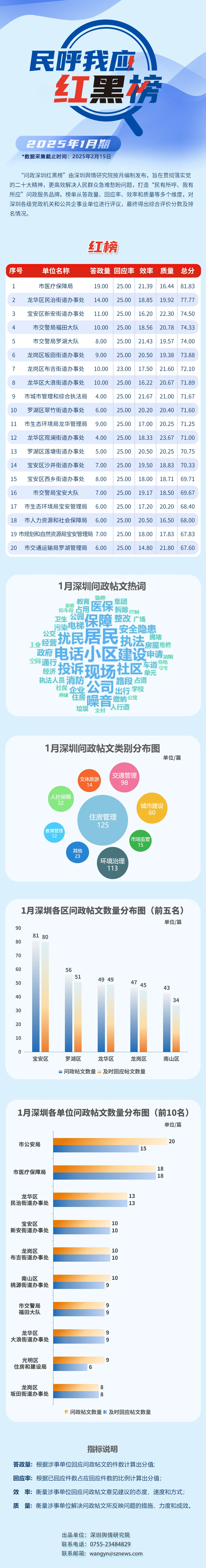 “深圳民呼我應(yīng)紅黑榜”由深圳輿情研究院按月編制發(fā)布,旨在貫徹落實(shí)黨的二十大精神,更高效解決人民群眾急難愁盼問題,打造“民有所呼、我有所應(yīng)”問政服務(wù)品牌。榜單從答政量、回應(yīng)率、效率和質(zhì)量等多個(gè)維度對(duì)深圳各級(jí)黨政機(jī)關(guān)和公共企事業(yè)單位進(jìn)行評(píng)議,最終得出綜合評(píng)價(jià)分?jǐn)?shù)及排名情況。