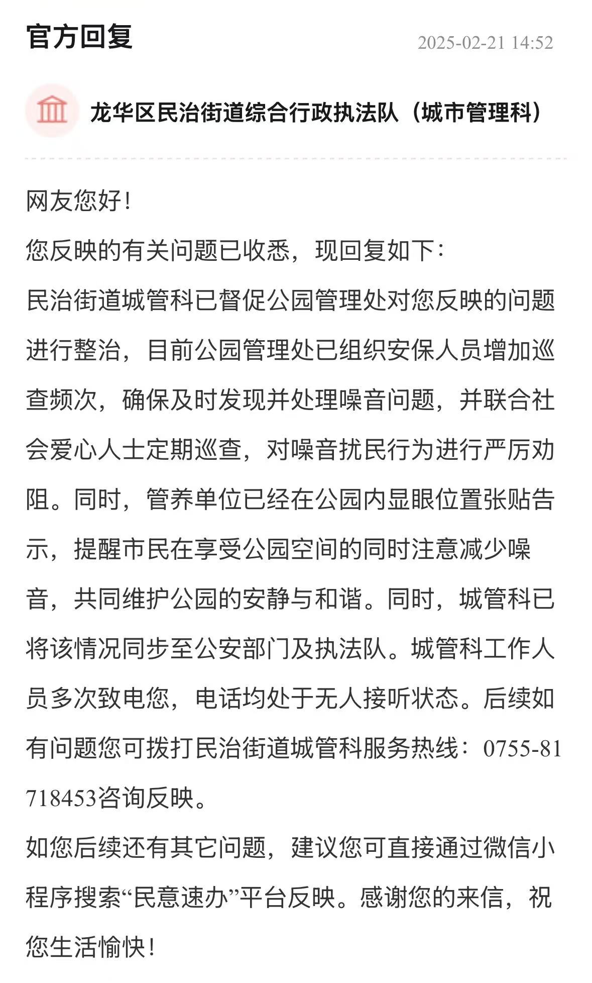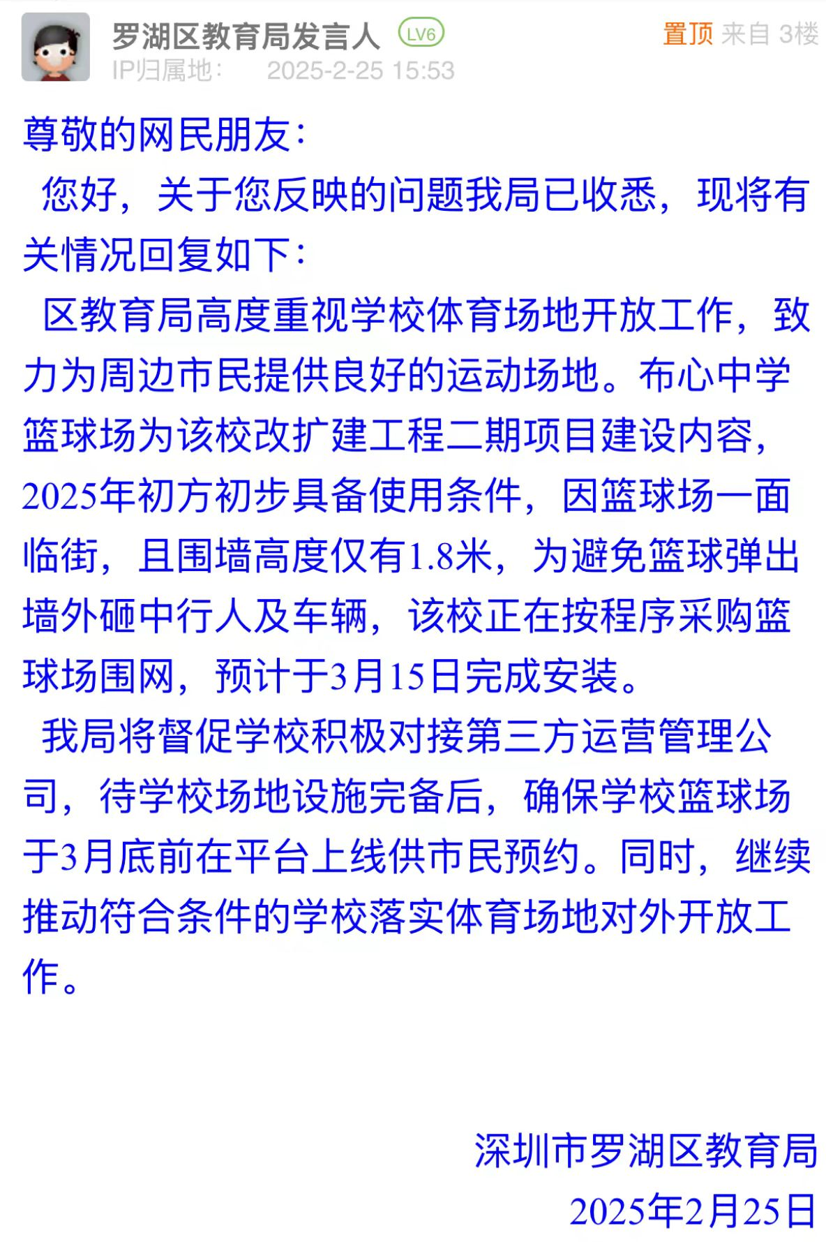 案例點評:市民關(guān)注布心中學(xué)籃球場開放時間,反映出對公共運動空間的迫切需求。羅湖區(qū)教育局詳細說明場地未開放原因及施工節(jié)點,并明確后續(xù)開放計劃,有效化解群眾疑慮,有助于“全民健身”政策更好落地。