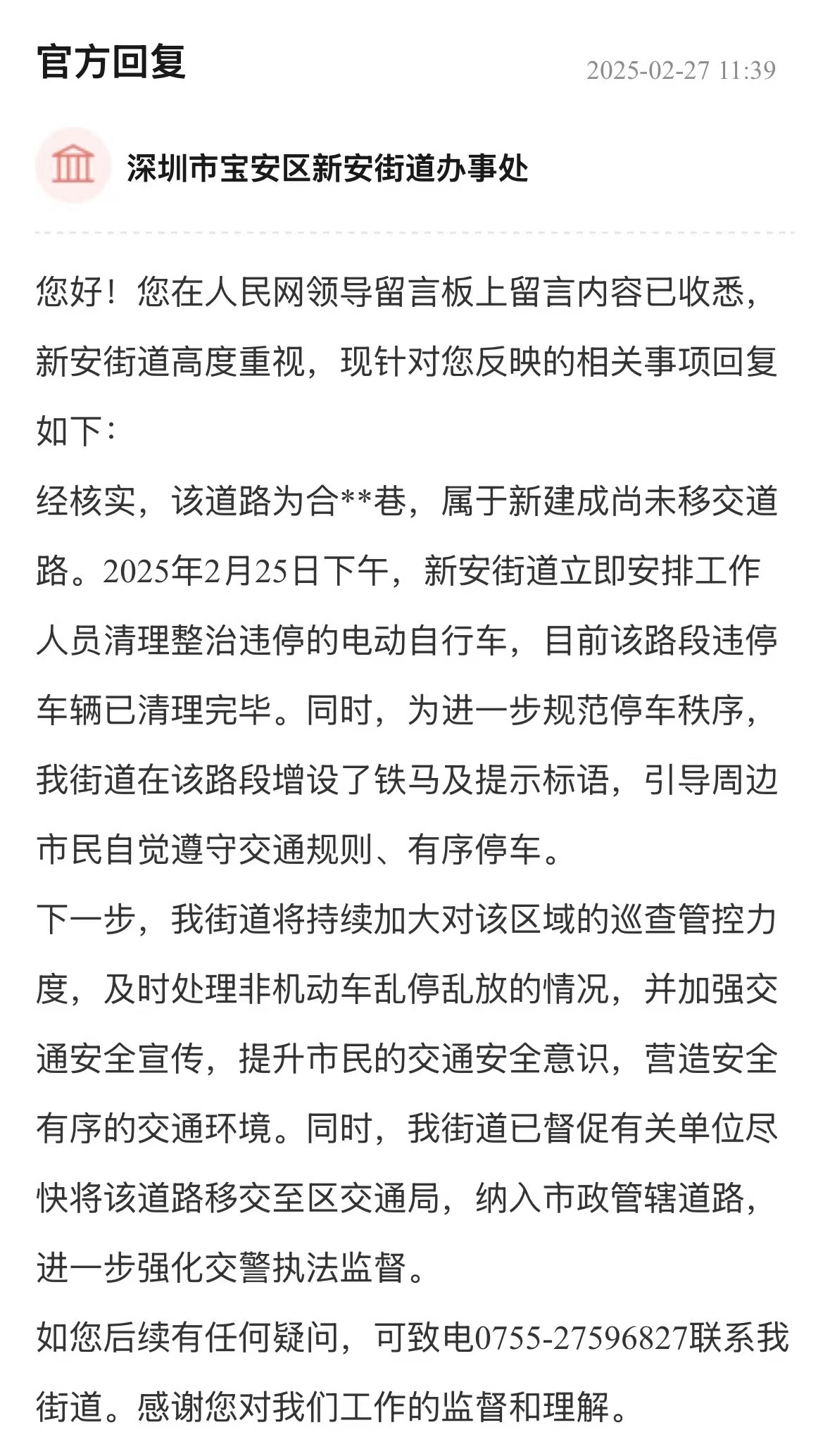 案例點評:非機動車亂停放影響交通和消防安全,嚴(yán)重影響市民生活。街道辦行動迅速,第一時間清理違停車輛,增設(shè)鐵馬及提示標(biāo)語,規(guī)范停車秩序,展現(xiàn)了高效的處置能力?;貞?yīng)中,街道還制定了長效治理計劃,構(gòu)建“短期整治+長效管理”模式,有助于解決區(qū)域交通問題,提升城市管理水平。
