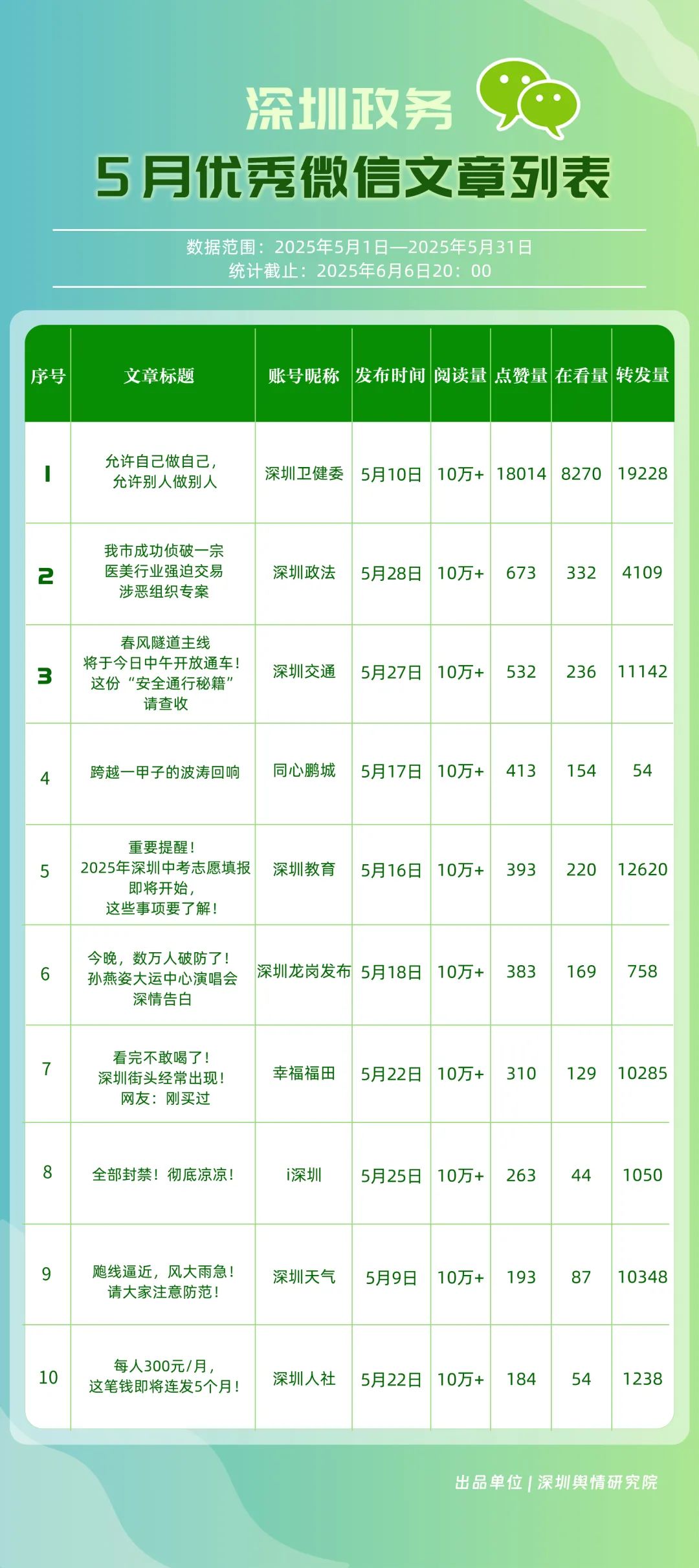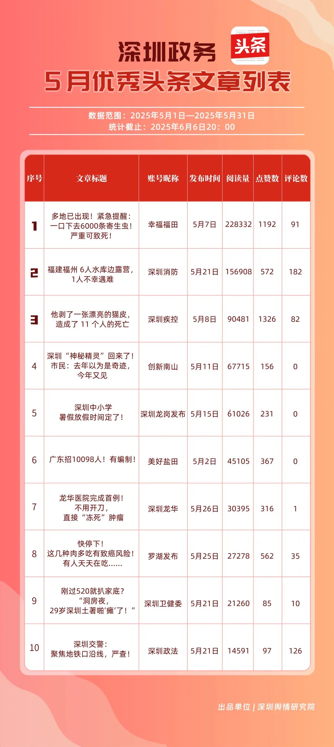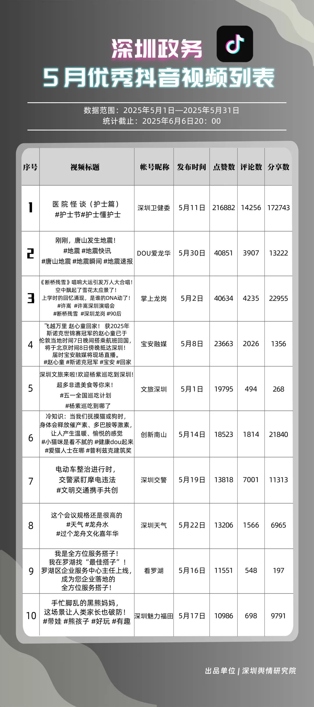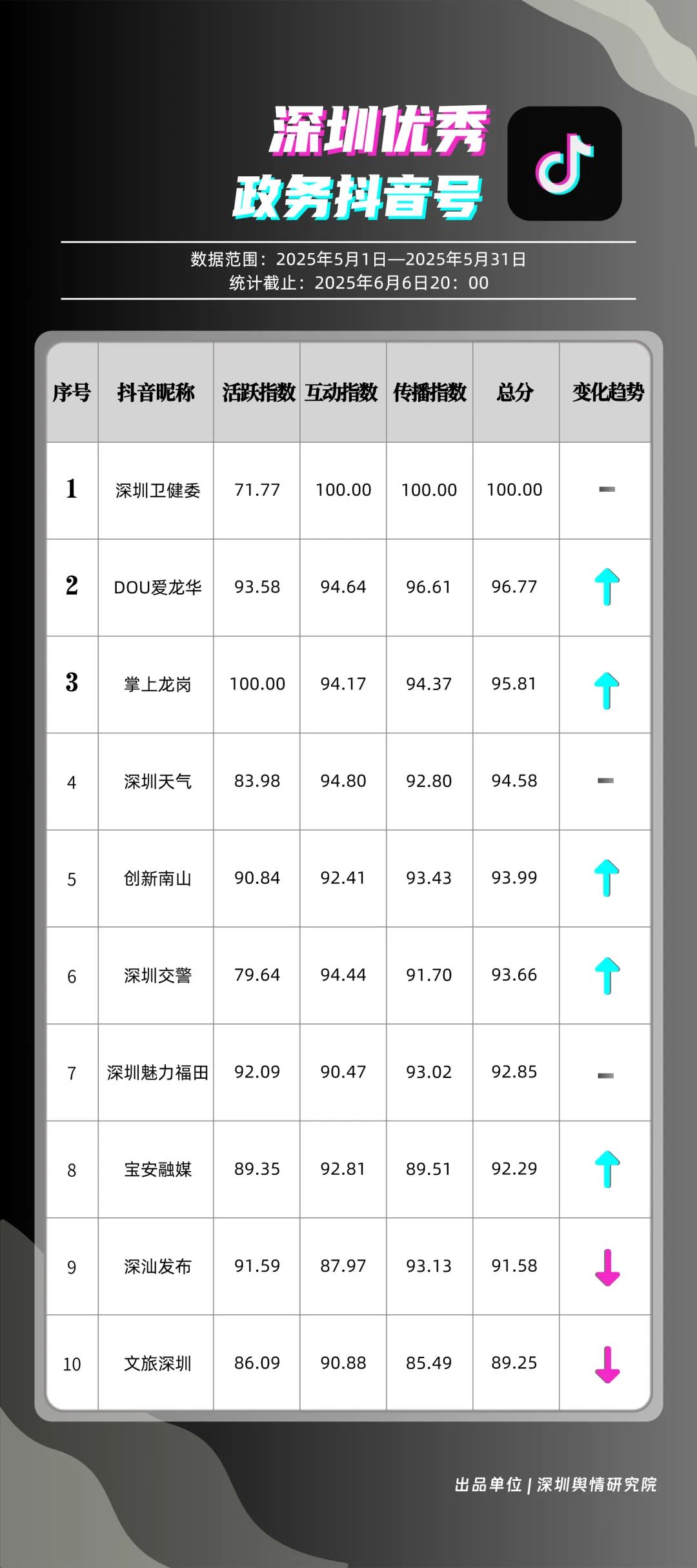5月,“幸福福田”“深圳消防”“創(chuàng)新南山”“深圳疾控”“羅湖發(fā)布”“深圳龍崗發(fā)布”“坪山發(fā)布”“青春深圳”“深圳龍華”“深圳人社”共10個(gè)政務(wù)頭條號(hào)入選“優(yōu)秀政務(wù)頭條號(hào)”榜單。在榜單前三名中,“幸福福田”“創(chuàng)新南山”以穩(wěn)定且高質(zhì)量的內(nèi)容輸出,持續(xù)領(lǐng)跑,排名較上個(gè)月未發(fā)生變動(dòng)。位居榜單第二的“深圳消防”同樣表現(xiàn)亮眼,排名較上個(gè)月提升2個(gè)名次,充分展現(xiàn)了其在消防安全宣傳領(lǐng)域的持續(xù)深耕和創(chuàng)新突破。上榜政務(wù)頭條號(hào)各展所長(zhǎng),以優(yōu)質(zhì)內(nèi)容為核心,充分發(fā)揮平臺(tái)傳播優(yōu)勢(shì),為政務(wù)信息的高效觸達(dá)與廣泛傳播樹立了標(biāo)桿。