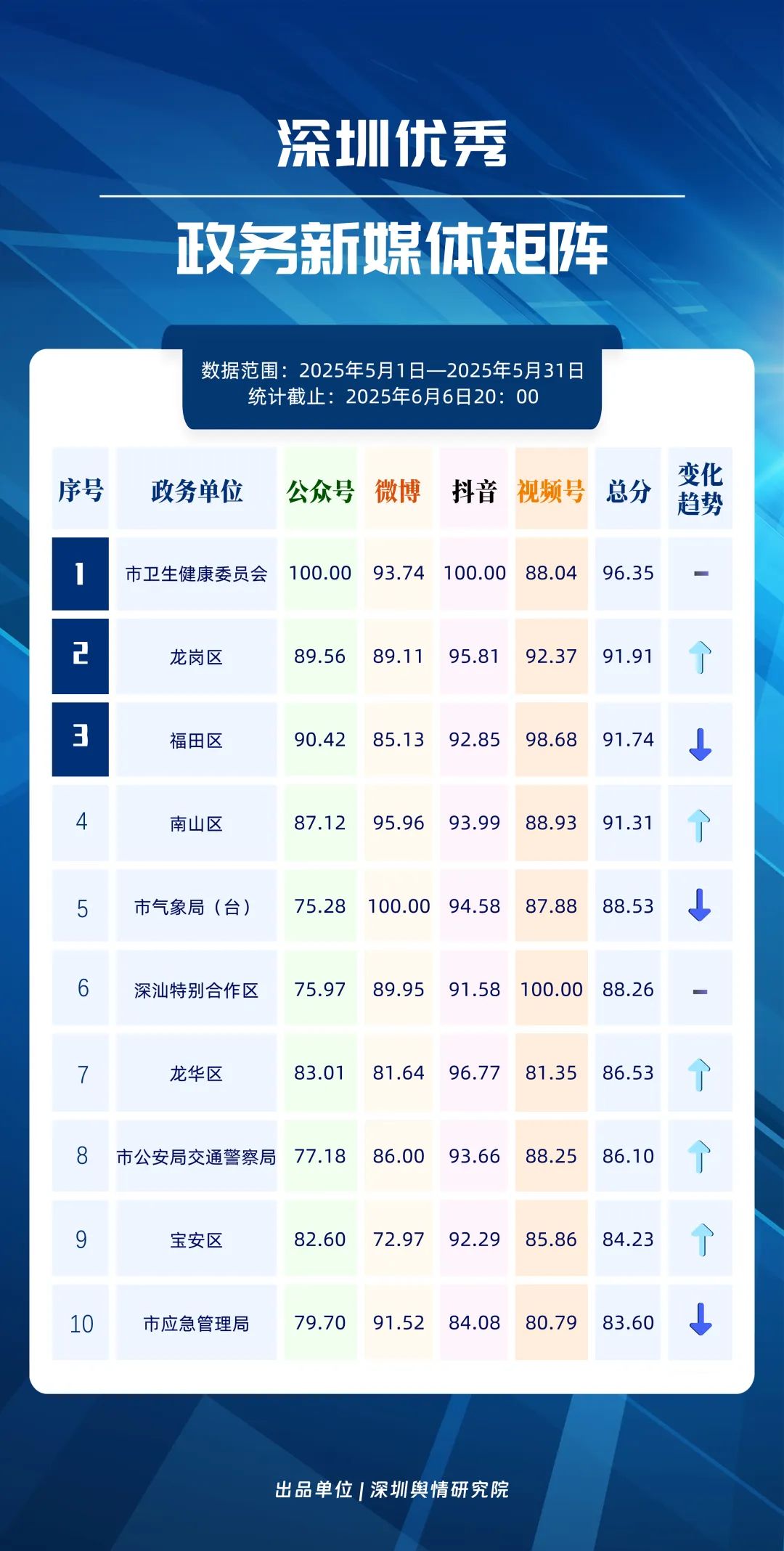 5月,深圳政務(wù)新媒體矩陣各展所長(zhǎng),為市民帶來豐富實(shí)用的信息服務(wù)。市衛(wèi)生健康委、龍崗區(qū)、福田區(qū)、南山區(qū)、市氣象局、深汕特別合作區(qū)、龍華區(qū)、市公安局交通警察局、寶安區(qū)、市應(yīng)急管理局入選“深圳優(yōu)秀政務(wù)新媒體矩陣”榜單。從排名變化來看,與4月相比,龍崗區(qū)、南山區(qū)、龍華區(qū)、市公安局交通警察局、寶安區(qū)的排名均有顯著提升。其中,龍崗區(qū)通過優(yōu)化微博和微信視頻號(hào)的內(nèi)容運(yùn)營(yíng),有效提升了互動(dòng)性和傳播效能;南山區(qū)則在微博和抖音平臺(tái)發(fā)力,取得了較好的運(yùn)營(yíng)成效。這些成績(jī)充分展現(xiàn)了各政務(wù)新媒體矩陣在運(yùn)營(yíng)方面的創(chuàng)新活力,為提升政府服務(wù)效能作出了積極貢獻(xiàn)。