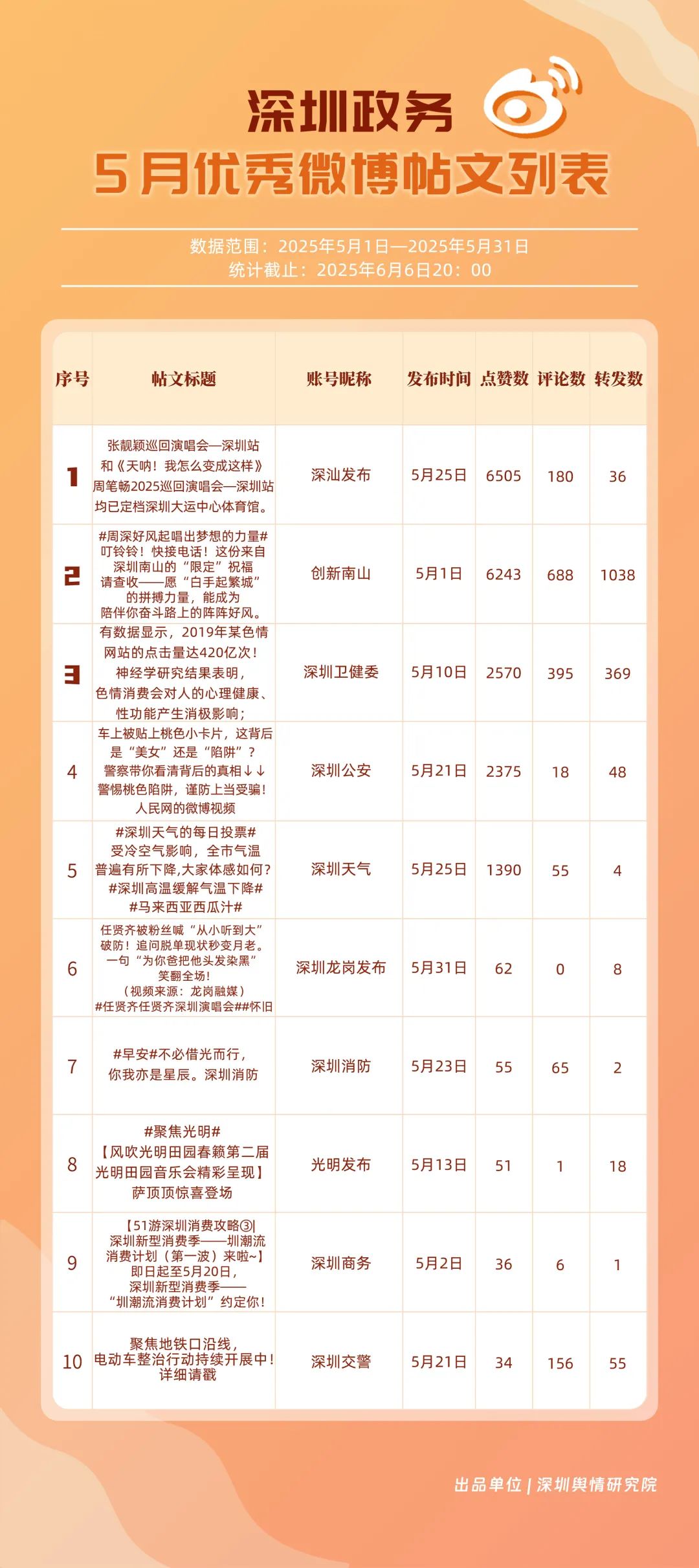 5月,“深圳天氣”“創(chuàng)新南山”“深圳衛(wèi)健委”“深圳消防”“深圳應(yīng)急管理”“深汕發(fā)布”“深圳公安”“深圳龍崗發(fā)布”“深圳交警”“福田發(fā)布”等20個(gè)賬號(hào)入選“優(yōu)秀政務(wù)微博號(hào)”。其中,“深圳天氣”憑借活躍指數(shù)和互動(dòng)指數(shù)雙項(xiàng)滿分的亮眼成績(jī),穩(wěn)居榜單首位?!皠?chuàng)新南山”以95.96分緊隨其后,在互動(dòng)、傳播指數(shù)得分大幅提升,排名實(shí)現(xiàn)顯著躍升?!吧钲谛l(wèi)健委”“深圳消防”“深圳應(yīng)急管理”也表現(xiàn)卓越,總分均超過90分,它們憑借權(quán)威信息發(fā)布、專業(yè)知識(shí)科普,展現(xiàn)了各單位在民生服務(wù)、公共安全領(lǐng)域的重要作用。以上優(yōu)秀政務(wù)微博號(hào)深度契合平臺(tái)的傳播特征,善于借助熱門話題擴(kuò)大影響力,以鮮明的賬號(hào)特色展現(xiàn)區(qū)域風(fēng)采。