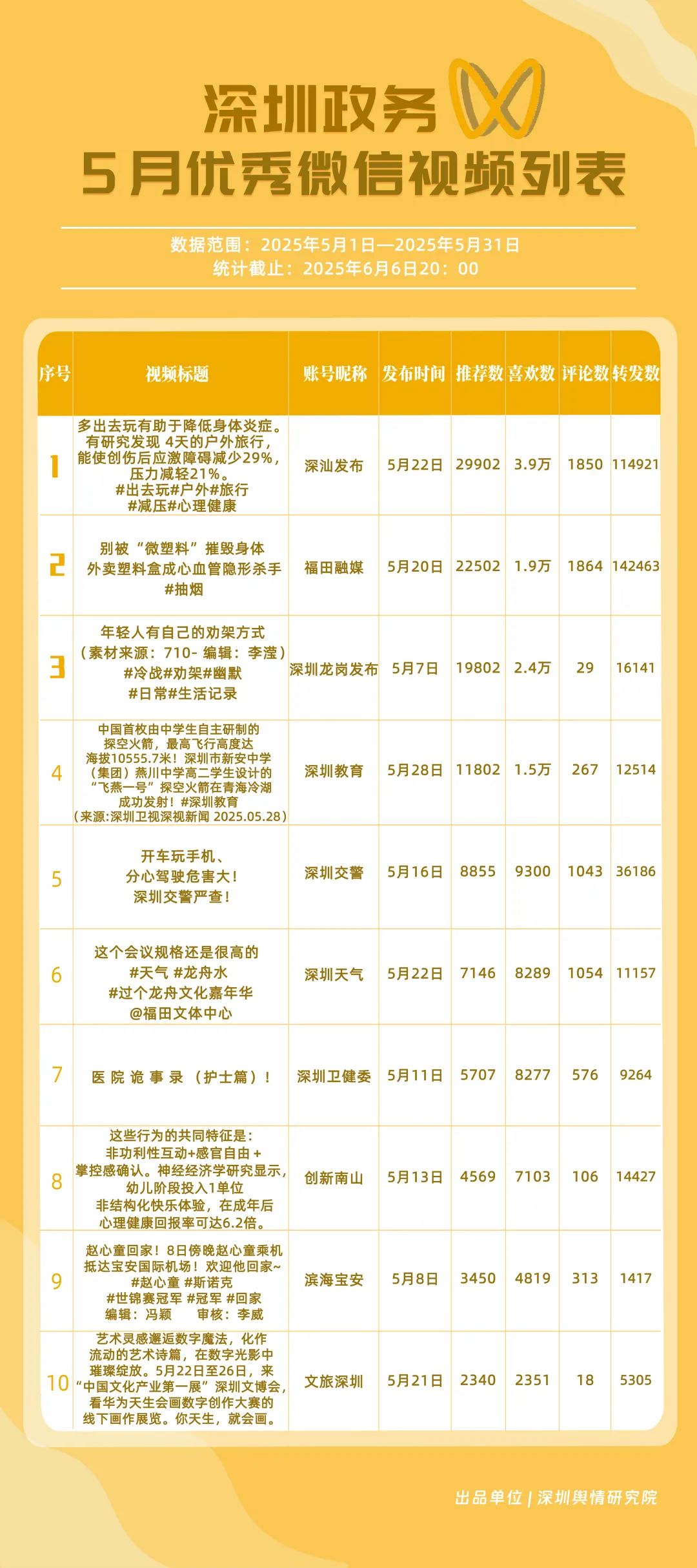 5月,獲得“深圳優(yōu)秀政務(wù)微信視頻號(hào)”稱號(hào)的是“深汕發(fā)布”“福田融媒”“深圳龍崗發(fā)布”“創(chuàng)新南山”“深圳交警”“深圳衛(wèi)健委”“深圳天氣”“深圳教育”“濱海寶安”“青春深圳”。其中,“深汕發(fā)布”保持了熱點(diǎn)內(nèi)容輸出的穩(wěn)定性和時(shí)效性,延續(xù)了上個(gè)月的優(yōu)異表現(xiàn)?!案L锶诿健薄吧钲邶垗彴l(fā)布”排名緊隨其后,其中“深圳龍崗發(fā)布”在互動(dòng)指數(shù)方面獲得滿分,搭建了高效的政民互動(dòng)橋梁。這些優(yōu)秀的政務(wù)微信視頻號(hào)以各自的優(yōu)勢(shì),展現(xiàn)出深圳政務(wù)新媒體矩陣在視頻傳播賽道的蓬勃活力,為政務(wù)信息傳播開辟更親民和高效的賽道。