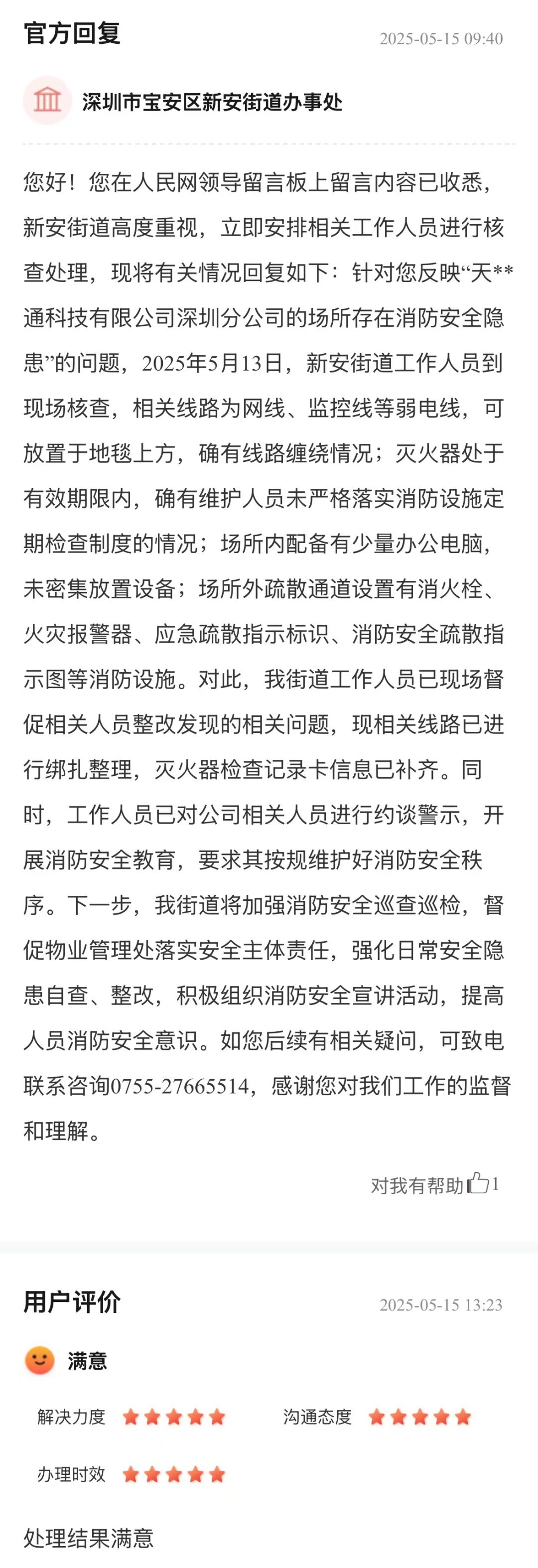 企業(yè)電氣線路混亂、滅火器維護(hù)缺位等消防隱患,直接威脅員工生命財(cái)產(chǎn)安全,更潛藏重大事故風(fēng)險(xiǎn)。街道辦收到市民反饋后,迅速核查并高效解決現(xiàn)存問題,以“即知即改”的行動(dòng)力回應(yīng)群眾關(guān)切。后續(xù)通過約談警示、安全宣教等舉措,從“治已病”轉(zhuǎn)向“防未病”,切實(shí)筑牢區(qū)域消防安全屏障,展現(xiàn)基層對安全隱患的快速治理能力,傳遞出“民生安全無小事”的責(zé)任擔(dān)當(dāng),獲得網(wǎng)民的五星好評。