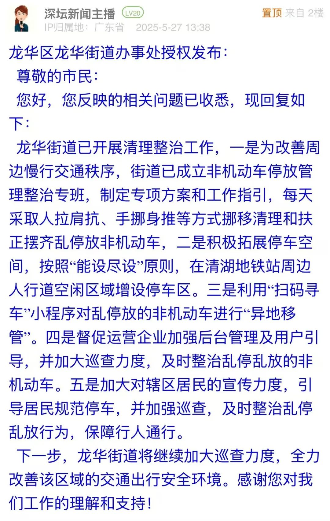 案例點(diǎn)評:地鐵口電動(dòng)車與共享單車堆積,既阻礙行人通行,更影響區(qū)域交通秩序與城市形象。龍華街道辦接訴后迅速響應(yīng),成立專項(xiàng)整治專班,通過每日清理扶正、增設(shè)停車區(qū)、“掃碼尋車”移管、督促企業(yè)巡查及居民宣傳引導(dǎo)等多維度舉措,破解亂停難題,以“疏堵結(jié)合”的治理智慧,快速行動(dòng),綜合施策,為改善區(qū)域交通環(huán)境提供了務(wù)實(shí)范本。