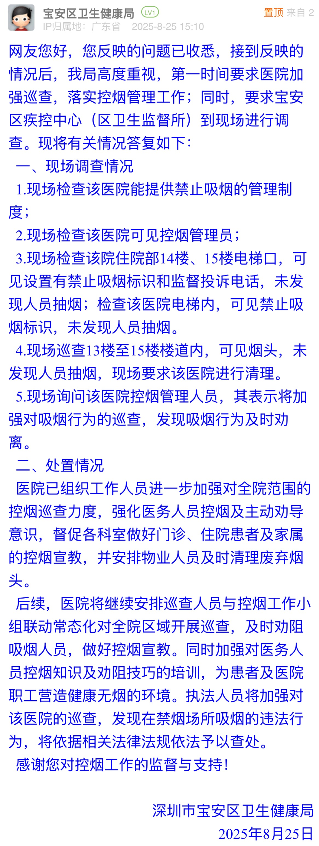 優(yōu)化建議:接到市民反饋后,寶安區(qū)衛(wèi)生健康局快速組織現(xiàn)場調(diào)查,核實(shí)醫(yī)院有禁煙制度、控?zé)煿芾韱T在崗,基礎(chǔ)控?zé)煷胧┖瞬榈轿?,值得點(diǎn)贊。但回應(yīng)中多次強(qiáng)調(diào)“未發(fā)現(xiàn)人員抽煙”,回避對(duì)歷史吸煙行為處置、煙頭來源及勸阻機(jī)制失效的解釋,與市民關(guān)切脫節(jié),難以消除市民對(duì)醫(yī)院日???zé)熌芰Φ膿?dān)憂,建議完善具體控?zé)煷胧?,如加裝煙感報(bào)警裝置,建立核查公示制度等,筑牢“無煙醫(yī)院”防線。