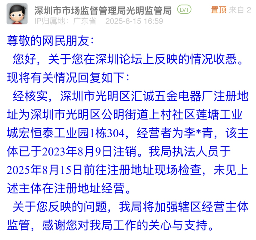 優(yōu)化建議:深圳市市場監(jiān)督管理局光明管理局的回應(yīng)中,核實(shí)了涉事電器廠已注銷,且不在注冊地經(jīng)營,也提及加強(qiáng)轄區(qū)主體監(jiān)管,但市民反映的排插套用注銷主體信息銷售、違規(guī)標(biāo)識(shí)3C標(biāo)志等關(guān)鍵問題,未得到明確解答。若回應(yīng)中能豐富指引類內(nèi)容,如告知市民可向平臺(tái)追責(zé)的途徑、提交證據(jù)的具體方式,為市民維權(quán)提供清晰方向,將更貼合市民需求,也能讓回應(yīng)更具實(shí)際意義。