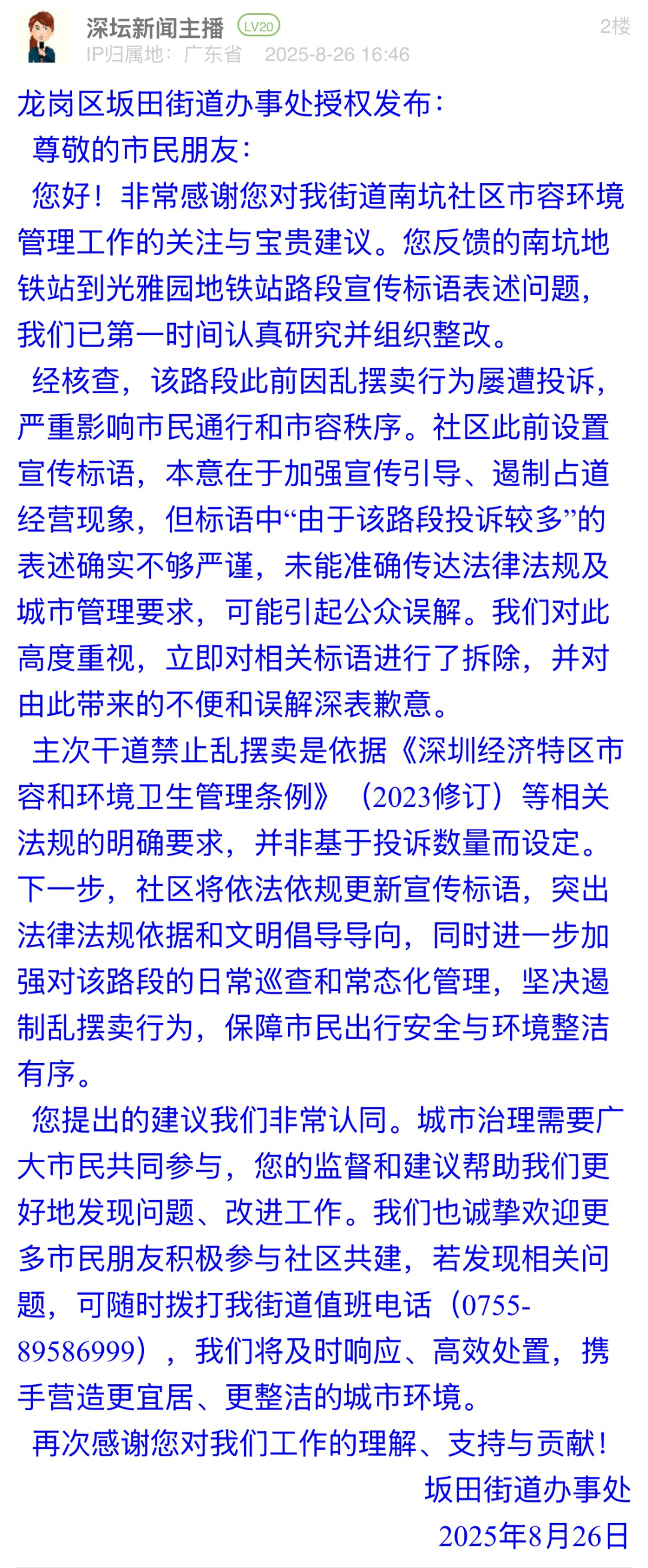 案例點(diǎn)評(píng):標(biāo)語表述不嚴(yán)謹(jǐn)可能引發(fā)公眾誤解,坂田街道辦展現(xiàn)出高效務(wù)實(shí)的態(tài)度,第一時(shí)間拆除涉事標(biāo)語,計(jì)劃更新標(biāo)語,明確標(biāo)語中提及的禁擺依據(jù)為法規(guī)要求而非投訴數(shù)量?;貞?yīng)中,街道主動(dòng)致歉并公開整改邏輯,展現(xiàn)“直面問題不推諉”的擔(dān)當(dāng),更以“邀請市民參與共建”為切入點(diǎn),構(gòu)建“政府主導(dǎo)+公眾監(jiān)督”的治理閉環(huán)。此次整改有效化解因標(biāo)語表述不當(dāng)引發(fā)的公眾疑慮,彰顯了“以民為師”的共治智慧。