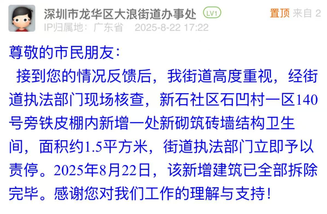 案例點(diǎn)評(píng):8月21日晚間,市民發(fā)布帖文反映違建問題,大浪街道以“雷霆處置”展現(xiàn)安全至上的治理擔(dān)當(dāng)。接到投訴后,街道迅速核查,在22日給出回應(yīng),表示已完成拆除工作,做到了“速辦速結(jié),質(zhì)效雙優(yōu)”。此次響應(yīng)既體現(xiàn)“隱患即事故”的底線思維,更以“發(fā)現(xiàn)即拆除”的高效行動(dòng),彰顯基層治理對(duì)民生安全的敏銳感知與果斷處置能力,切實(shí)筑牢居民“身邊安全”防線。