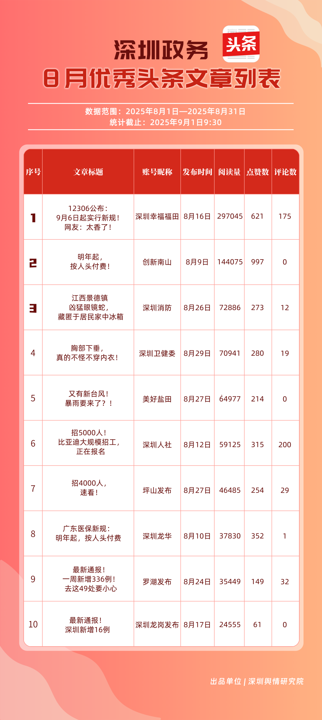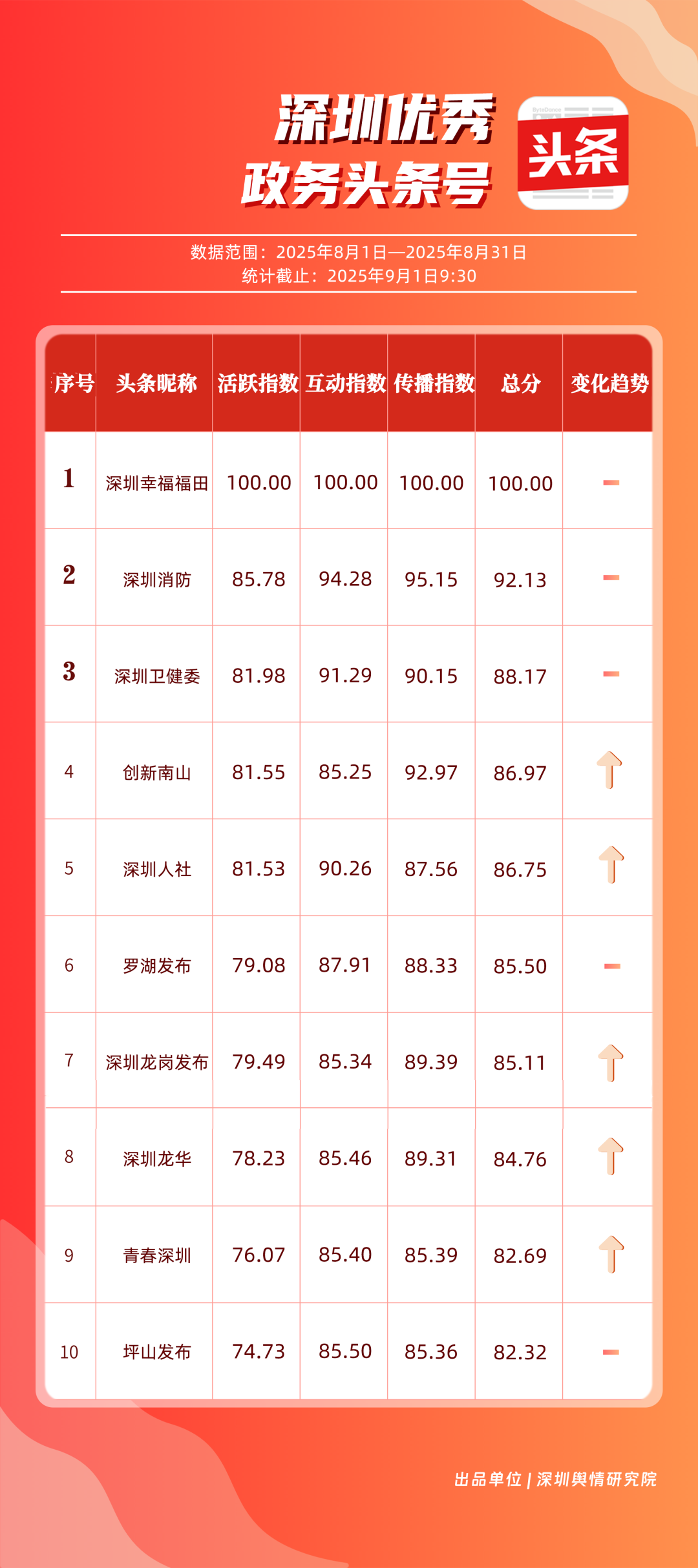 8月,“深圳幸福福田”“深圳消防”“深圳衛(wèi)健委”“創(chuàng)新南山”“深圳人社”“羅湖發(fā)布”“深圳龍崗發(fā)布”“深圳龍華”“青春深圳”“坪山發(fā)布”共10個政務頭條號入選“優(yōu)秀政務頭條號”榜單。“深圳幸福福田”憑借持續(xù)優(yōu)異的綜合表現,以滿分成績穩(wěn)居榜單首位,彰顯出強大的政務傳播力與影響力;“深圳消防”“深圳衛(wèi)健委”則以穩(wěn)定的內容質量與深厚的民眾基礎,持續(xù)為市民提供權威、及時的服務信息,排名穩(wěn)固?!皠?chuàng)新南山”“深圳人社”等上榜賬號亦表現亮眼,聚焦民生服務傳遞政策溫度,共同構成政務新媒體矩陣的中堅力量,為城市治理與民生服務注入鮮活動能。