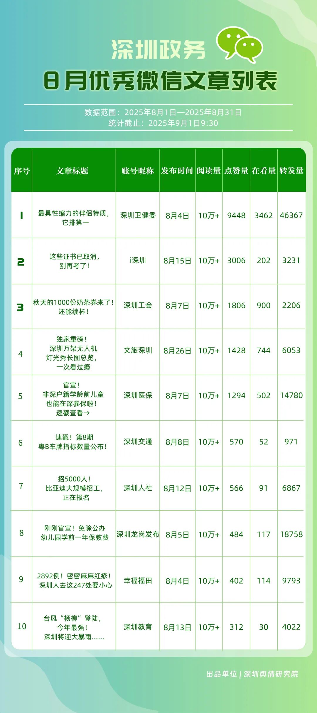 8月,30個政務微信公眾號入選“深圳優(yōu)秀政務微信公眾號”榜單,其中包括“深圳衛(wèi)健委”“深圳龍崗發(fā)布”“幸福福田”“i深圳”“創(chuàng)新南山”“深圳工會”“青春深圳”“深圳龍華”“深圳教育”“深圳光明”等。8月,“深圳衛(wèi)健委”66篇推文獲得超10萬次閱讀,以滿分位于榜單首位;“深圳龍崗發(fā)布”積極傳遞民生信息,依托區(qū)域活動開展宣傳,推動傳播效果顯著提升,位居第二;“幸福福田”關注區(qū)域發(fā)展動態(tài),排名第三?!癷深圳”“創(chuàng)新南山”“深圳工會”“青春深圳”等政務賬號在信息發(fā)布中不斷提升內容豐富性,深耕優(yōu)質服務,評分在85分以上。上榜微信公眾號立足自身特色優(yōu)勢,以精品內容為核心競爭力,在政務傳播領域樹立了標桿形象,成為兼具影響力與公信力的示范樣本。