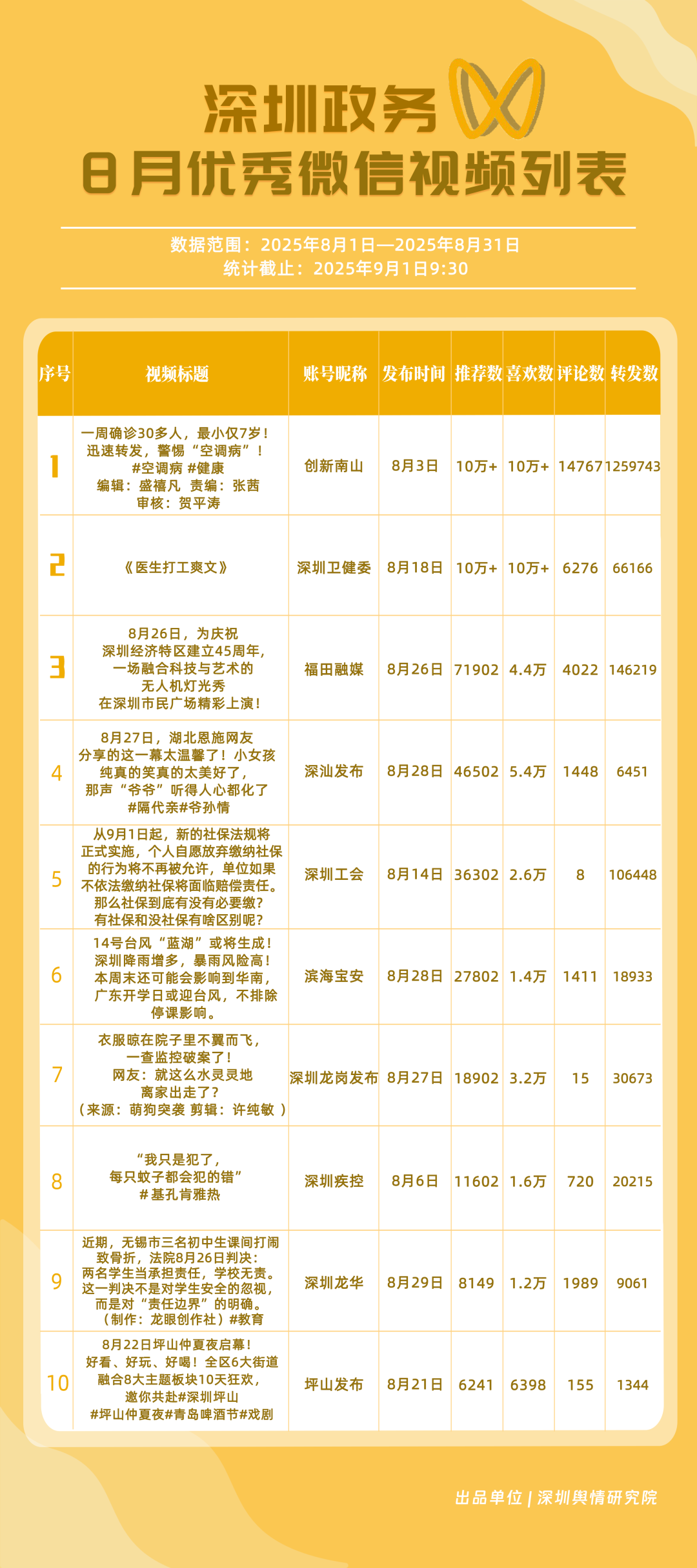 8月,獲得“深圳優(yōu)秀政務微信視頻號”稱號的是“創(chuàng)新南山”“深圳衛(wèi)健委”“深汕發(fā)布”“福田融媒”“深圳龍崗發(fā)布”“濱海寶安”“深圳工會”“深圳龍華”“青春深圳”“深圳天氣”。其中,“創(chuàng)新南山”一視頻提醒市民警惕“空調病”,獲百萬次轉發(fā),賬號憑借該視頻位列榜單第一名;“深圳衛(wèi)健委”視頻“醫(yī)生打工爽文”“傷痛蚊學”等作品在微信視頻號平臺獲得較好數據,助推其位列榜單第二名;“深汕發(fā)布”在內容互動性上獲得較好成效,單項指標得分達到100分,以92.01的評分位列榜單第三名?!案L锶诿健薄吧钲邶垗彴l(fā)布”等賬號也獲得不錯成績,上榜微信視頻號依托平臺的傳播優(yōu)勢,用簡短視頻呈現各類信息,打造政務宣傳的亮眼名片。