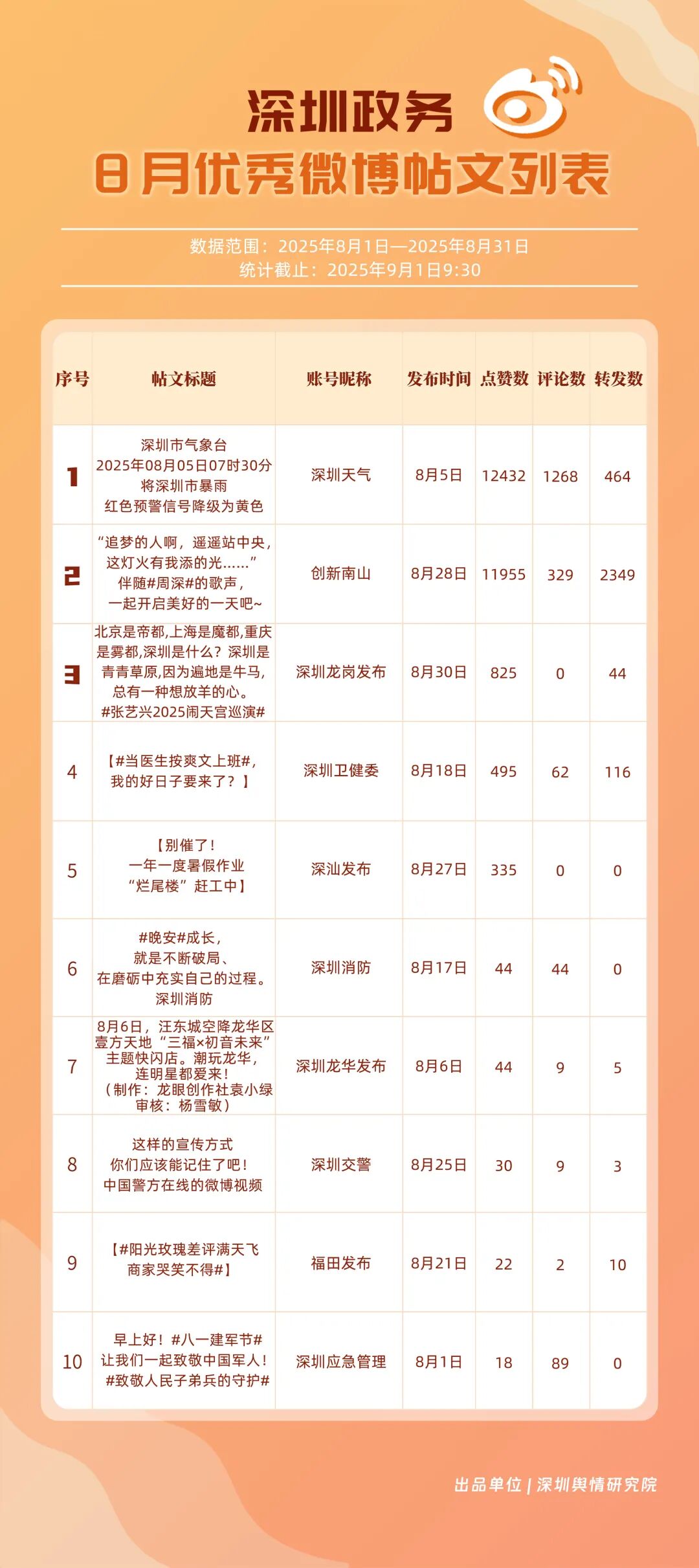 8月,深圳政務新媒體矩陣持續(xù)優(yōu)化內容生態(tài),各單位依托平臺特色深化服務效能,市衛(wèi)生健康委員會、南山區(qū)、福田區(qū)、龍崗區(qū)、深汕特別合作區(qū)、市氣象局(臺)、龍華區(qū)、市消防救援支隊、寶安區(qū)、光明區(qū)的新媒體矩陣入選“深圳優(yōu)秀政務新媒體矩陣”榜單。8月,優(yōu)秀單位加速崛起,整體呈現“內容專業(yè)化、服務場景化、傳播精準化”的發(fā)展態(tài)勢,市衛(wèi)生健康委員會以優(yōu)質視頻內容收獲高互動量,憑借權威健康科普內容強勢登頂;南山區(qū)新媒體矩陣在微博平臺持續(xù)保持良好表現,并在視頻號平臺表現突出,位列榜單第二;福田區(qū)新媒體矩陣依托抖音平臺的民生資訊視頻穩(wěn)居前三,用戶粘性進一步提升。此外,深汕特別合作區(qū)、市消防救援支隊、寶安區(qū)新媒體矩陣持續(xù)聚焦市民需求,排名有所上升,展現了深圳政務新媒體矩陣的活力。