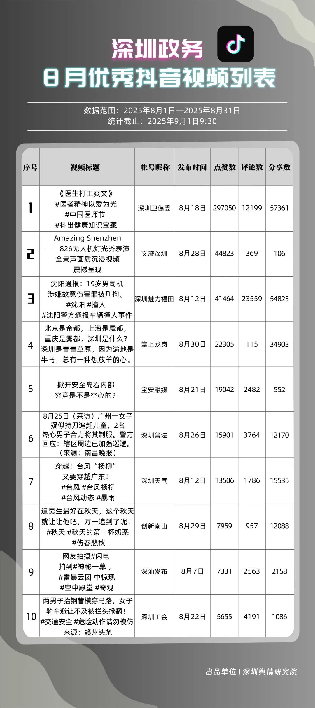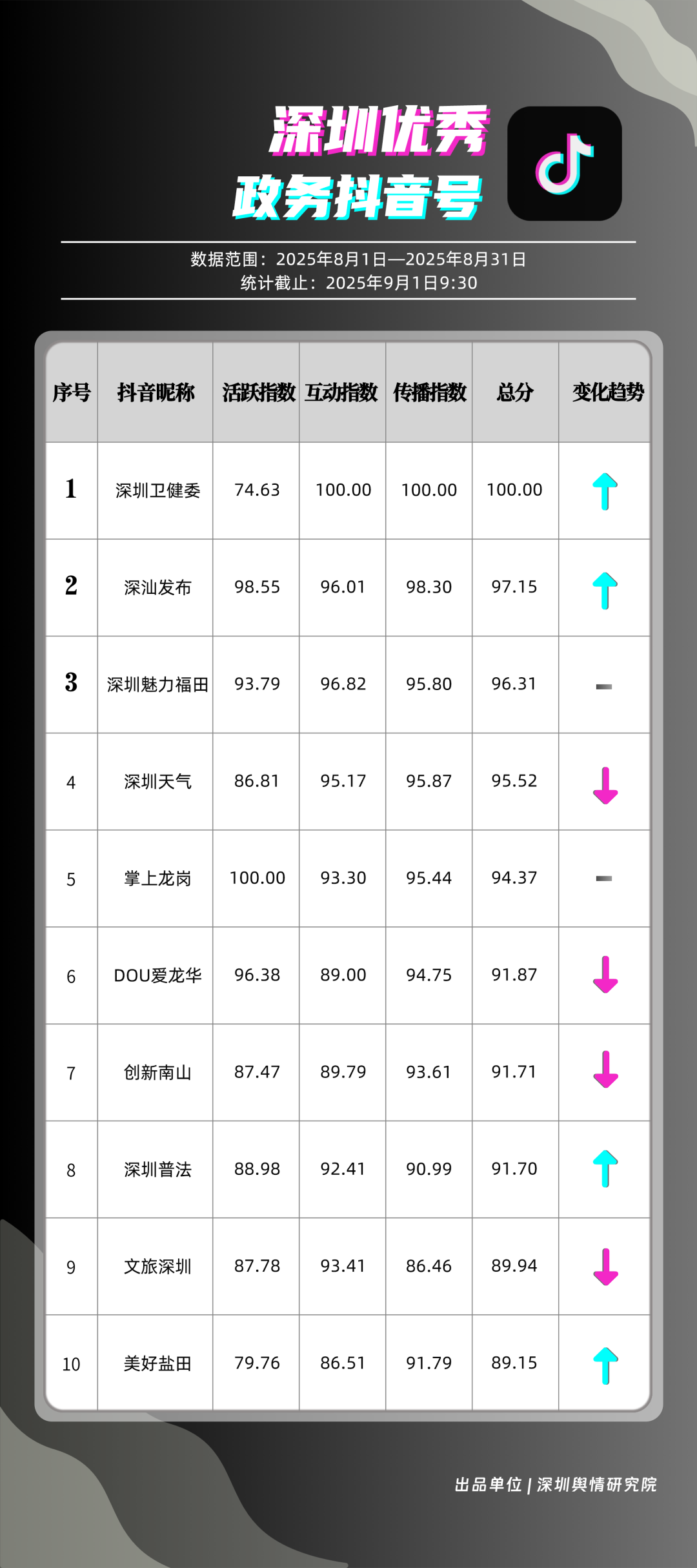 8月,“深圳衛(wèi)健委”“深汕發(fā)布”“深圳魅力福田”“深圳天氣”“掌上龍崗”“DOU愛龍華”“創(chuàng)新南山”“深圳普法”“文旅深圳”“美好鹽田”共10個政務抖音號獲得“優(yōu)秀政務抖音號”稱號?!吧钲谛l(wèi)健委”內容吸引大量網民關注,4條視頻累計獲得超50萬次點贊,排名從上期的第九名上升至第一名;“深汕發(fā)布”憑借較高的傳播指數評分,位列第二名,排名有所上升。“深圳魅力福田”“深圳天氣”等賬號緊隨其后,得分均在95分左右。上榜的優(yōu)秀政務抖音號深耕優(yōu)質創(chuàng)作,精準把握網民興趣點,使作品收獲高點贊、高轉發(fā),推動評論區(qū)形成良性互動氛圍,以優(yōu)秀內容提升政務傳播效能。