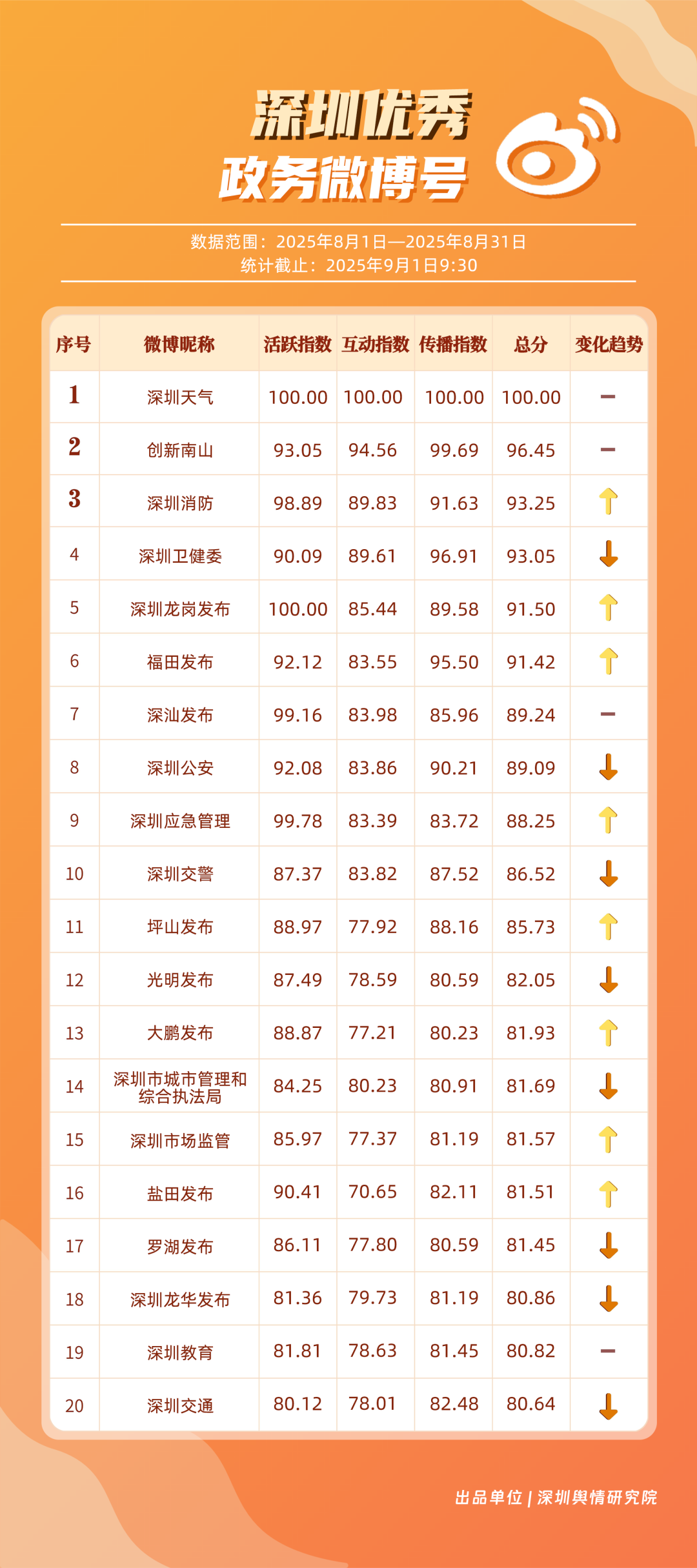 8月,“深圳天氣”“創(chuàng)新南山”“深圳消防”“深圳衛(wèi)健委”“深圳龍崗發(fā)布”“福田發(fā)布”“深汕發(fā)布”“深圳公安”“深圳應急管理”“深圳交警”等20個賬號入選“優(yōu)秀政務微博號”。其中,“深圳天氣”持續(xù)以優(yōu)質內容受到網民肯定,蟬聯榜首;“創(chuàng)新南山”傳播指數得分再提升,總分96.45,排名保持在第二位;“深圳消防”積極發(fā)布消防相關內容,以93.25分位列第三。上榜優(yōu)秀政務微博賬號精準把握網民興趣點,內容獨具風采,收獲網民認可,實現了較好的傳播效果。