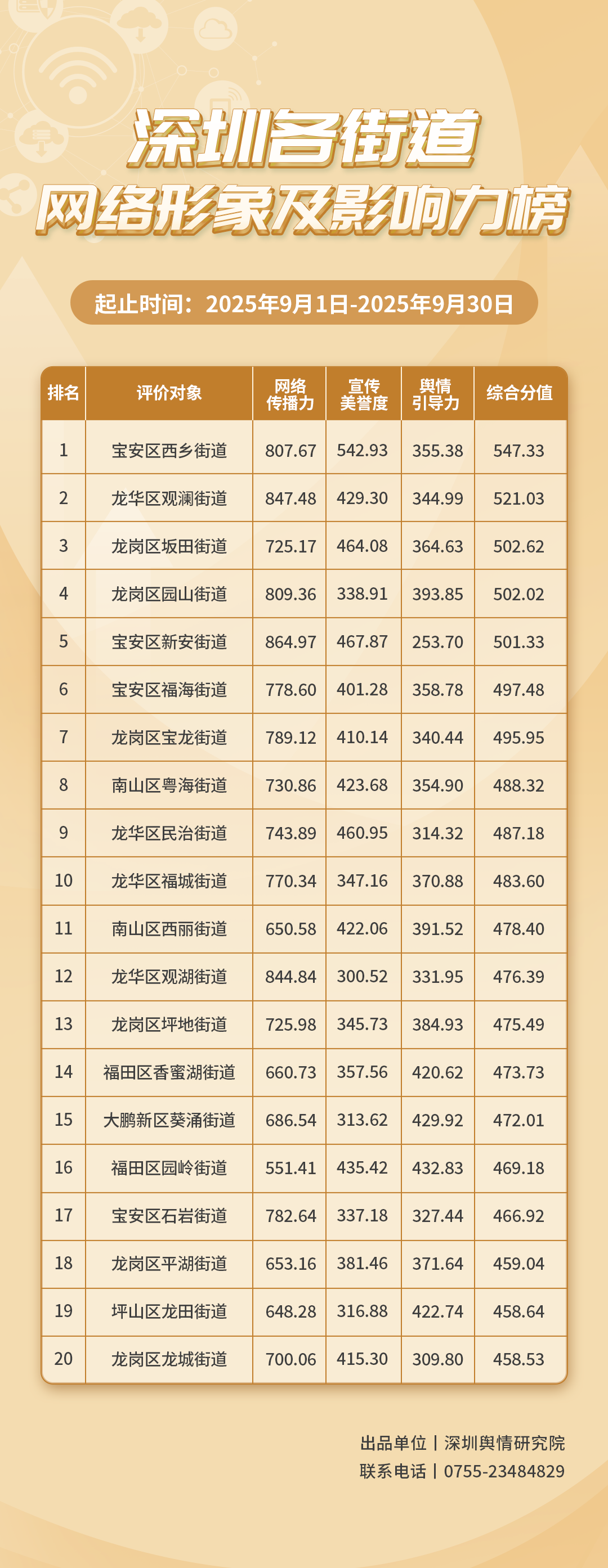 2025年9月,共有20個(gè)街道登上《深圳各街道網(wǎng)絡(luò)形象及影響力榜》,分別是:寶安區(qū)西鄉(xiāng)街道、龍華區(qū)觀瀾街道、龍崗區(qū)坂田街道、龍崗區(qū)園山街道、寶安區(qū)新安街道、寶安區(qū)福海街道、龍崗區(qū)寶龍街道、南山區(qū)粵海街道、龍華區(qū)民治街道、龍華區(qū)福城街道、南山區(qū)西麗街道、龍華區(qū)觀湖街道、龍崗區(qū)坪地街道、福田區(qū)香蜜湖街道、大鵬新區(qū)葵涌街道、福田區(qū)園嶺街道、寶安區(qū)石巖街道、龍崗區(qū)平湖街道、坪山區(qū)龍?zhí)锝值?、龍崗區(qū)龍城街道。