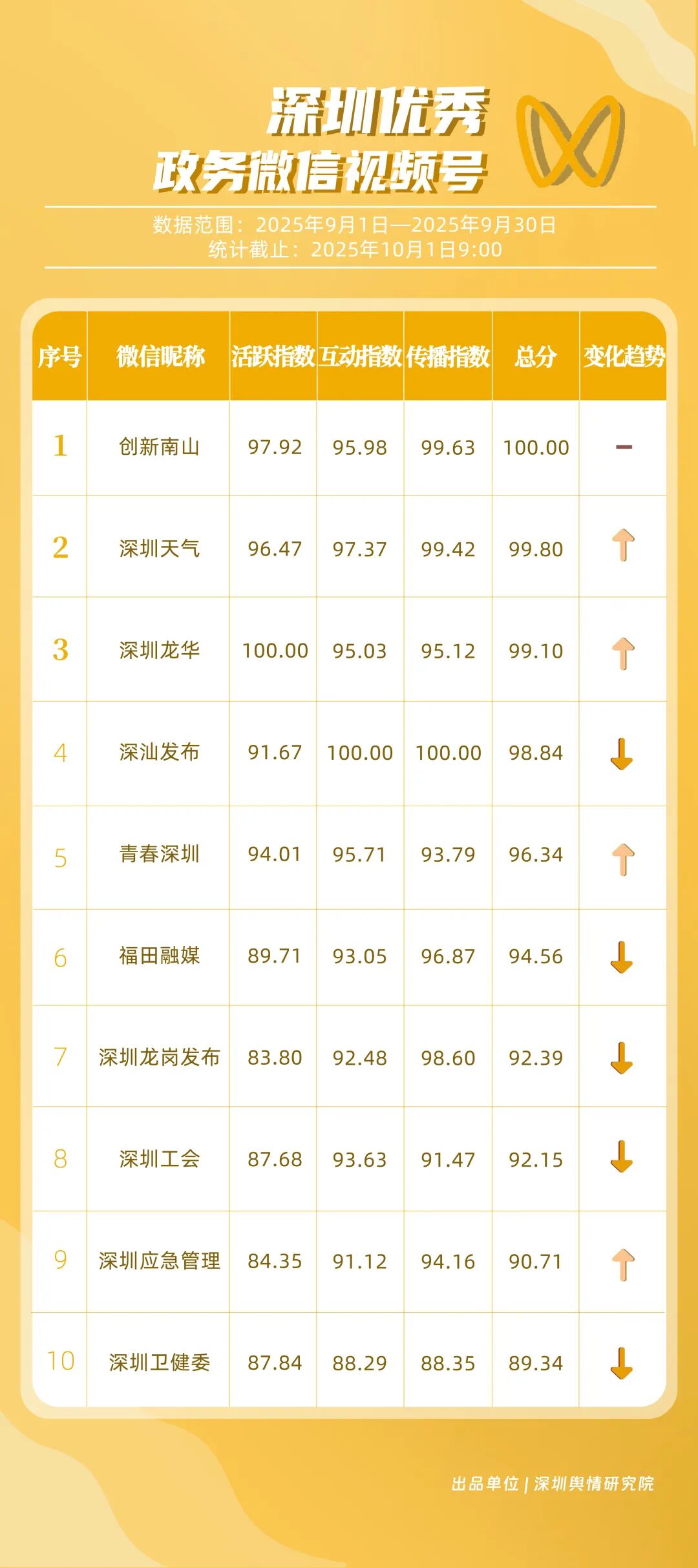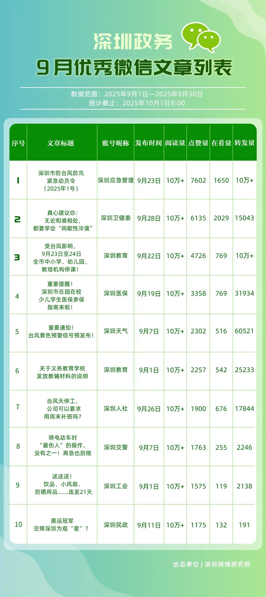 9月,“深圳衛(wèi)健委”“深圳龍崗發(fā)布”“幸福福田”“i深圳”“青春深圳”“深圳工會(huì)”“深圳教育”“深圳交通”“創(chuàng)新南山”“深圳應(yīng)急管理”等30個(gè)政務(wù)微信公眾號(hào)榮登“深圳優(yōu)秀政務(wù)微信公眾號(hào)”榜單。9月,“深圳衛(wèi)健委”以總分100.00的成績(jī)蟬聯(lián)榜單首位,其憑借突破常規(guī)視角的選題,解讀專業(yè)健康知識(shí),引發(fā)大量網(wǎng)民共鳴,內(nèi)容質(zhì)量與傳播力形成雙向賦能;“深圳龍崗發(fā)布”以總分93.24位居第二,聚焦區(qū)域民生服務(wù)升級(jí)等動(dòng)態(tài),信息觸達(dá)率不斷提升;“幸福福田”圍繞商圈經(jīng)濟(jì)復(fù)蘇、文化節(jié)慶活動(dòng)等主題開(kāi)展系列宣傳,增強(qiáng)區(qū)域活力展示,位列第三;“i深圳”“青春深圳”“深圳工會(huì)”等也持續(xù)優(yōu)化賬號(hào)內(nèi)容,通過(guò)實(shí)用信息推送強(qiáng)化政務(wù)服務(wù)定位。