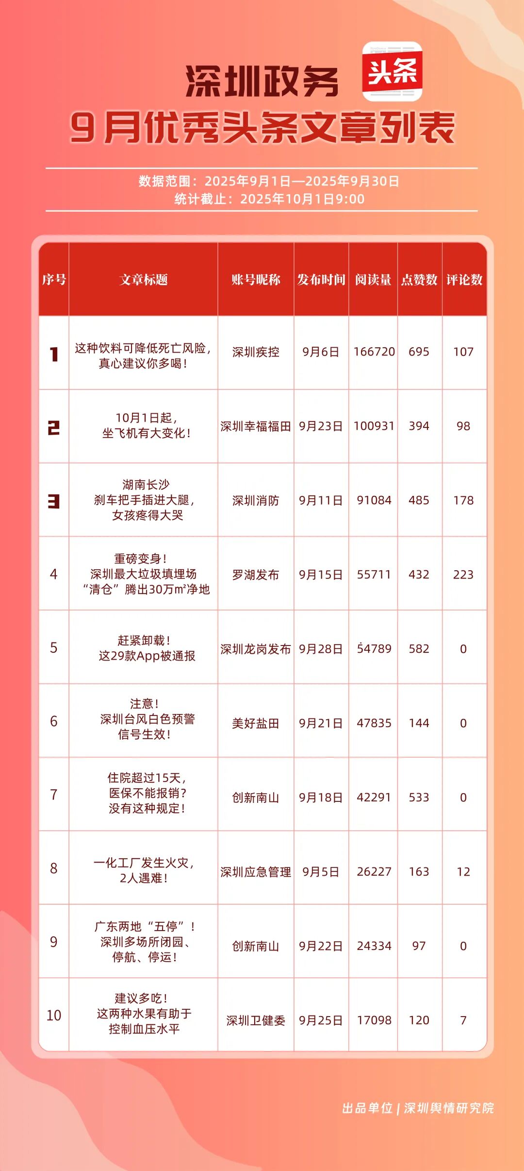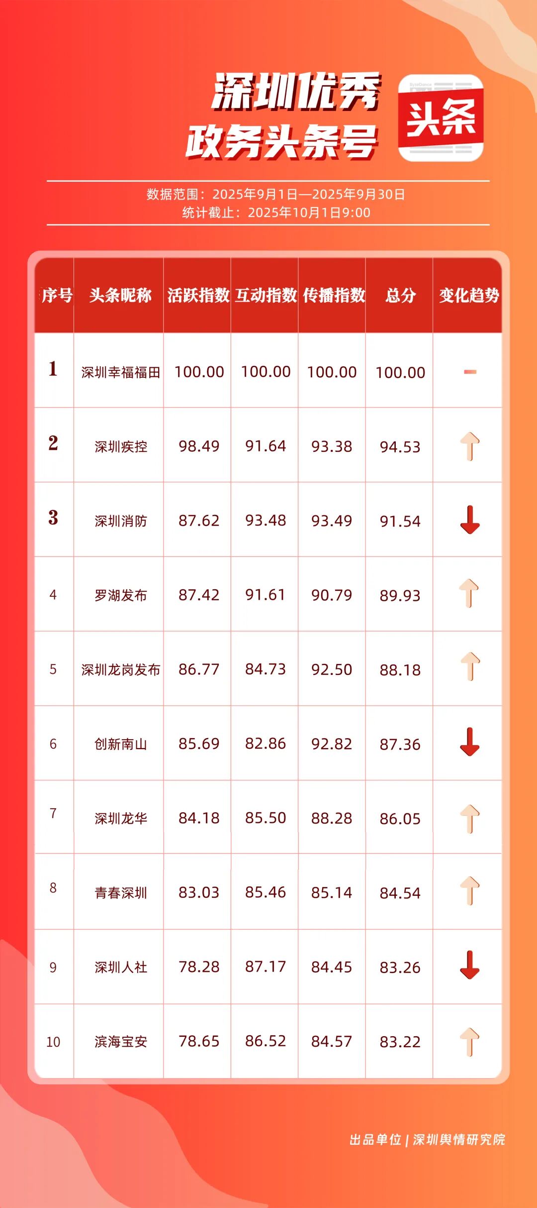 9月,“深圳幸福福田”“深圳疾控”“深圳消防”“羅湖發(fā)布”“深圳龍崗發(fā)布”“創(chuàng)新南山”“深圳龍華”“青春深圳”“深圳人社”“濱海寶安”共10個(gè)政務(wù)頭條號(hào)入選“優(yōu)秀政務(wù)頭條號(hào)”榜單。“深圳幸福福田”穩(wěn)居榜單首位,在傳播、互動(dòng)等方面均表現(xiàn)卓越;“深圳疾控”關(guān)注民生健康,有關(guān)“喝茶的好處”“非正規(guī)醫(yī)美針風(fēng)險(xiǎn)”兩篇文章閱讀均超10萬(wàn)次,為市民提供健康信息;“深圳消防”聚焦消防安全領(lǐng)域,提醒市民注意安全。相關(guān)上榜賬號(hào)表現(xiàn)優(yōu)異,注重內(nèi)容實(shí)用化、互動(dòng)場(chǎng)景化,彰顯了政務(wù)新媒體的服務(wù)效能。