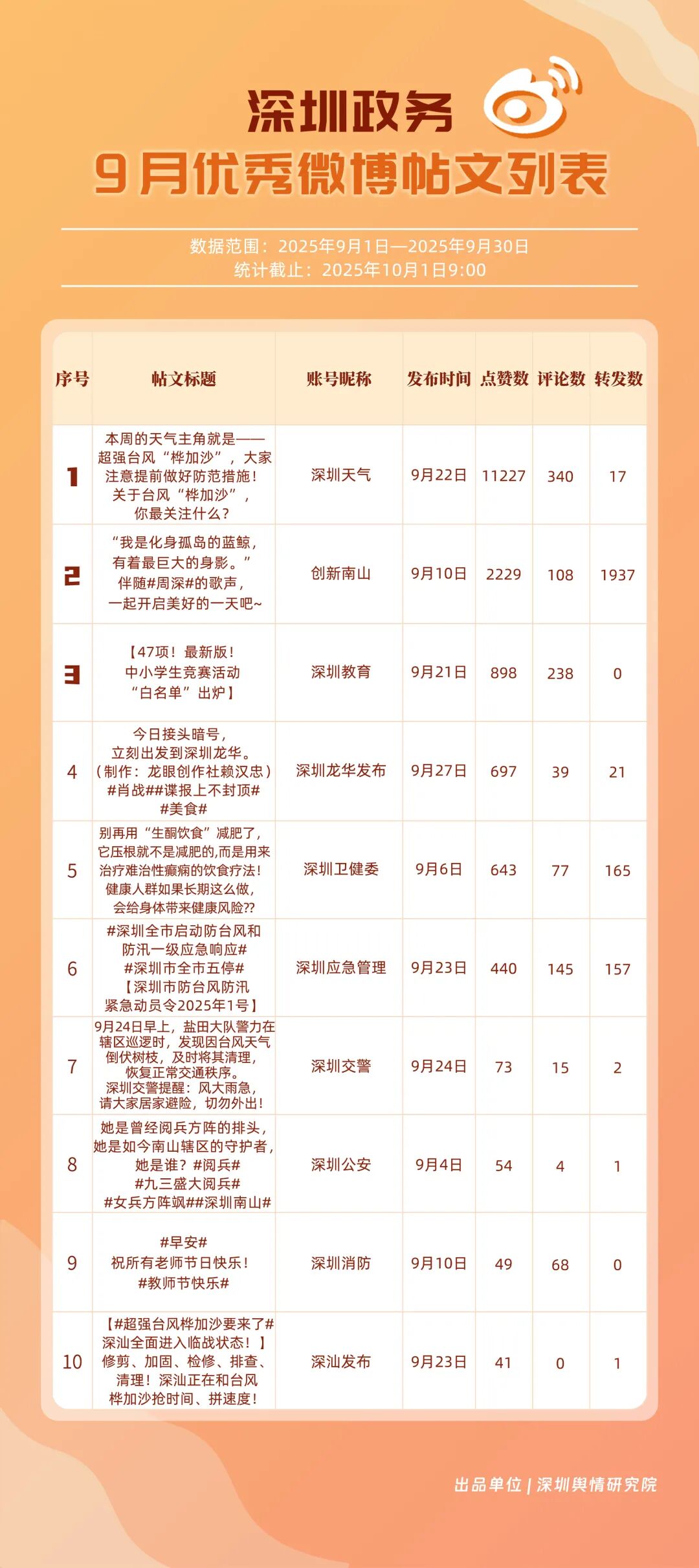 9月,20個(gè)賬號(hào)入選“優(yōu)秀政務(wù)微博號(hào)”榜單,其中包括:“深圳天氣”“創(chuàng)新南山”“深圳龍崗發(fā)布”“深圳衛(wèi)健委”“深圳消防”“深圳應(yīng)急管理”“福田發(fā)布”“深圳公安”“深圳交警”“深圳教育”等。其中,“深圳天氣”蟬聯(lián)榜首,尤其9月出現(xiàn)臺(tái)風(fēng)天氣,賬號(hào)受關(guān)注度再提升;“創(chuàng)新南山”賬號(hào)以多維度內(nèi)容策略實(shí)現(xiàn)傳播效能提升,其內(nèi)容中與歌手周深的聯(lián)動(dòng)也成為一大亮點(diǎn),獲得了較好傳播效果,以94.34分排名榜單第二;“深圳龍崗發(fā)布”“深圳衛(wèi)健委”兩賬號(hào)得分均在93分以上,在區(qū)域宣傳、內(nèi)容科普方向發(fā)力。上榜優(yōu)秀微博賬號(hào)展現(xiàn)出較高的內(nèi)容創(chuàng)新能力,以年輕化語(yǔ)態(tài)構(gòu)建傳播體系,形成兼具專業(yè)性與傳播力的優(yōu)秀案例。