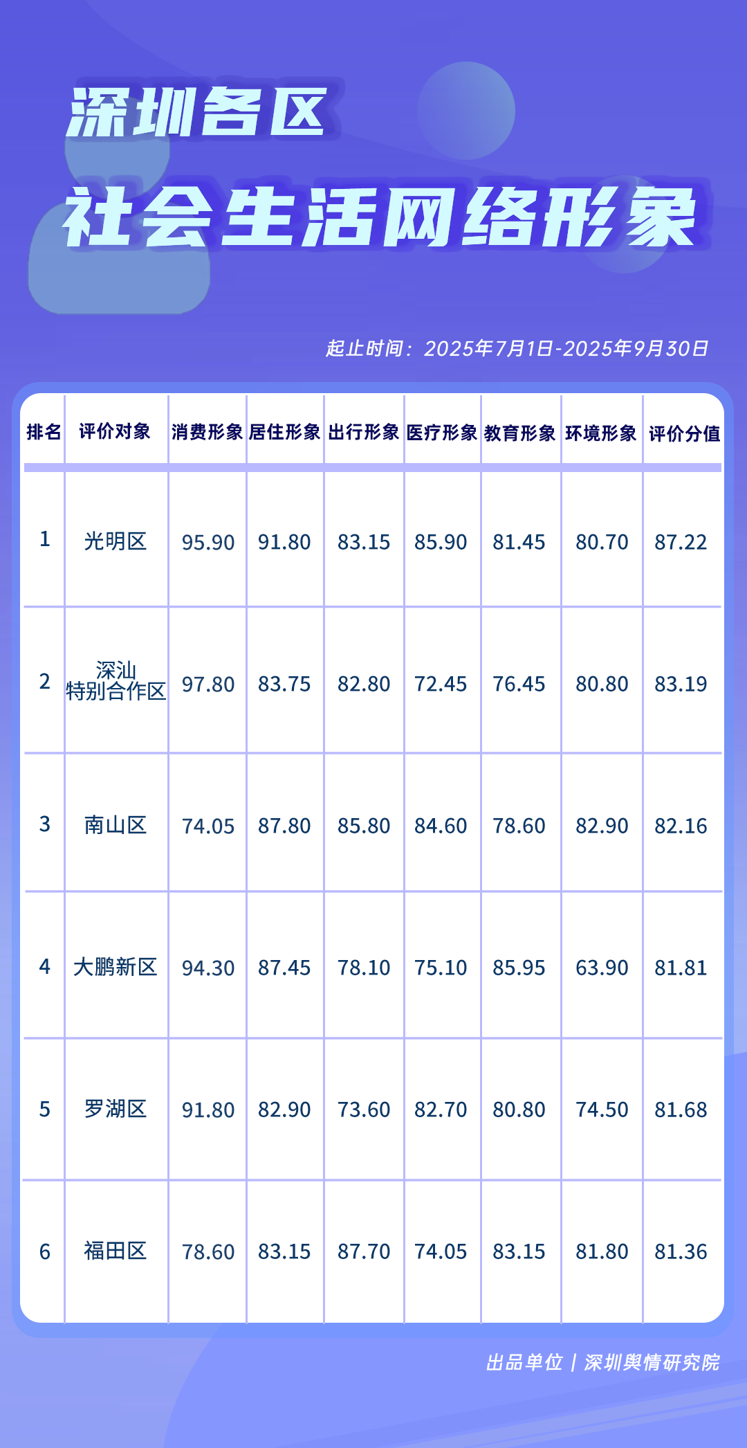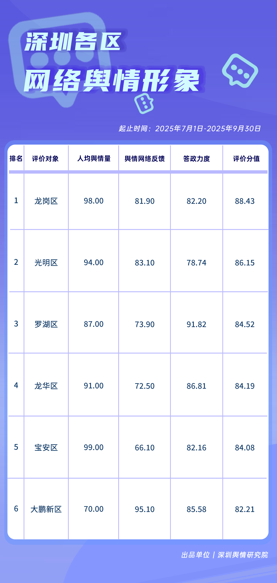 7-9月,各區(qū)各單位網(wǎng)絡(luò)形象建設(shè)成效如何?《深圳各區(qū)各單位網(wǎng)絡(luò)形象建設(shè)榜》帶您了解。本期榜單數(shù)據(jù)統(tǒng)計時間范圍為2025年7月1日至9月30日。